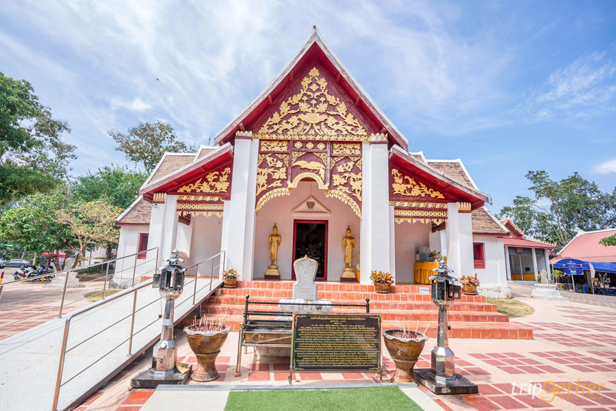 วัดศรีพันต้น วัดที่มีวิหารหลังใหญ่สีทองอร่ามที่โดดเด่นในเรื่องของสถาปัตยกรรมสุดอลังการ พญานาคเจ็ดเศียรขนาดใหญ่ที่มีลวดลายงดงามเลื้อยขนาบข้างทางขึ้นสู่วิหารถือเป็นมุมถสายรูปยอดนิยมที่นักท่องเที่ยวต่างแวะเวียนเข้ามาเพื่อถ่ายรูปอัปโซเชียล เมื่อเข้าสู่ภายในวิหารเราก็จะพบลวดลายจิตรกรรมฝาผนังที่เป็นการเล่าถึงประวัติการสร้างเมือง นอกจากนี้ภายในวัดยังมีโรงเก็บเรือที่มีเรือ “เรือเลิศเกียรติศักดิ์” เป็นเรือขุดด้วยไม้ต้นเดียวที่ใหญ่ที่สุดในไทยอีกด้วย