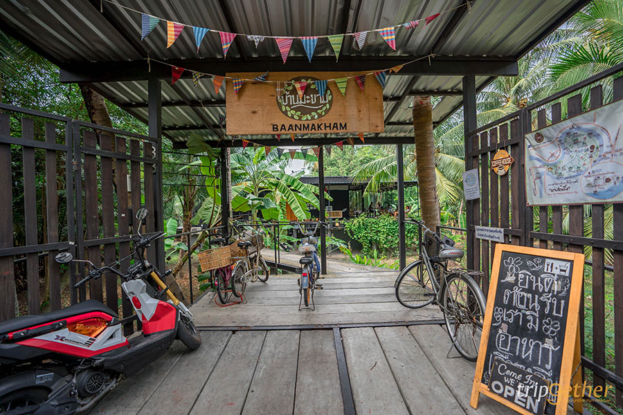 บ้านมะขาม ร้านกาแฟและร้านอาหารในสวนที่ซ่อนตัวอยู่ในตำบลบางน้ำผึ้ง บริเวณเดียวกันกับคุ้งบางกระเจ้าอย่างเงียบสงบ นอกจากจะเป็นร้านอาหารแล้ว ที่นี่ยังเปิดเป็นบ้านพักอีกด้วย ทำให้ตัวร้านมีบริเวณที่กว้างขวางพอสมควร ที่นั่งมีทั้งในร้านและนอกร้าน ใครอยากสัมผัสธรรมชาติแบบใกล้ชิดก็ขอแนะนำที่นั่งบนระเบียงด้านนอกเลย ร้านตกแต่งด้วยสไตล์มูจิและโฮมมี่ เน้นโทนสีน้ำตาลจากเฟอร์นิเจอร์ไม้ มีผ้าปูโต๊ะลายสก็อตสีสันสดใส ช่วยให้บรรยากาศร้านดูอบอุ่นและสดใสในเวลาเดียวกัน ในส่วนของเมนูก็มีทั้งอาหารคาว ของหวาน และเครื่องดื่ม เน้นไปที่อาหารไทยและของกินเล่น เครื่องดื่มก็มีทั้งแบบกาแฟและเครื่องดื่มทั่วไป ใครมาปั่นจักรยานที่บางกระเจ้า ก็แวะมากินอาหารร้านนี้ตอนพักเหนื่อยได้นะ