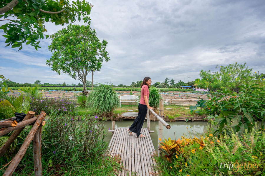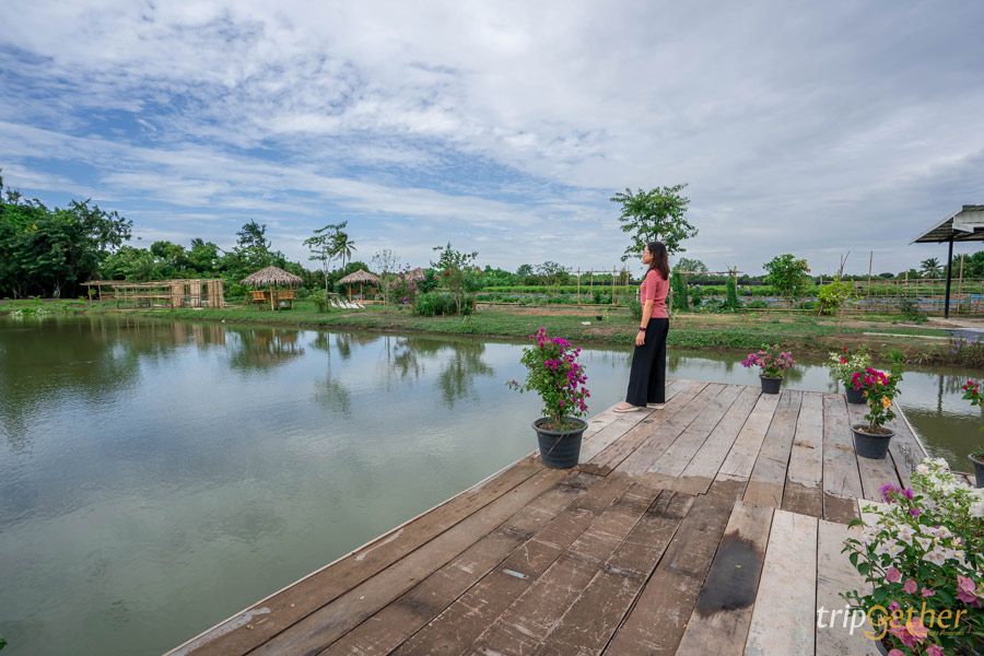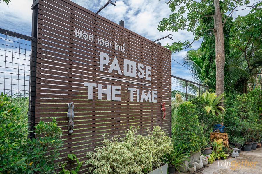 Pause The Time ร้านอาหารสไตล์คาเฟ่ในสวนอีกหนึ่งร้านในอำเภอบ้านแพ้ว ร้านตกแต่งสไตล์เรียบง่าย มีที่นั่งทั้งโซนอินดอร์และเอาท์ดอร์ ล้อมรอบด้วยบรรยากาศร่มรื่นจากบรรดาต้นไม้ ไฮไลท์เด็ดของที่นี่คือที่นั่งริมบึง เป็นลักษณะคล้ายแพยื่นลงไปในน้ำ เป็นมุมถ่ายรูปเก๋ๆ ได้อีกมุมนึงเลยล่ะ เมนูอาหารก็ครบเครื่อง มีทั้งของคาว ของหวาน ของกินเล่น และเครื่องดื่ม ในส่วนของคาวจะเป็นอาหารไทยและอาหารแนวฟิวชั่น อย่างเช่น สปาเก็ตตี้ขี้เมาผัดทะเล ข้าวไข่เจียวกุ้ง ส้มตำคอหมูย่าง ส่วนเครื่องดื่มจะเน้นไปที่แบบ non-coffee เช่น พีชลิ้นจี่สมูทตี้ เวรี่เบอร์รี่โซดา