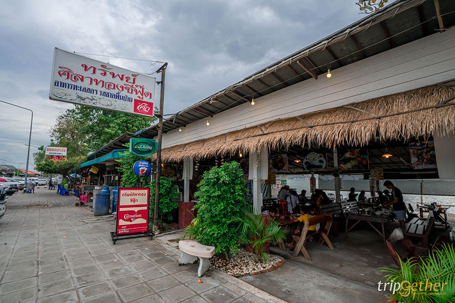 ทรัพย์ศิลาทองซีฟู้ด ร้านอาหารทะเลสดๆ รสชาติพื้นบ้านต้องที่นี่เลย ที่สำคัญการตกแต่งร้านแบบสบายๆ โปร่งและโล่ง เหมาะกับการพาครอบครัวหรือชวนเพื่อนมาเปลี่ยนที่กินข้าวในมื้อเที่ยงหรือมื้อเย็นเป็นที่สุด ส่วนของเมนูแนะนำก็คือ อ่อส่วนหอยนางรมตัวโตๆ ที่เสิร์ฟมาแบบกะทะร้อน แนะนำให้กินกับซอสที่มาคู่กันคือฟินสุดๆ ไม่เท่านั้นยังมีทั้ง ต้มยำปลากะพงน้ำใส กรรเชียงปู ไข่ตุ๋นทะเล ยำไข่ปู หอยนางรมสด และทอดมันกุ้ง ที่บอกเลยว่ามาแล้วต้องห้ามพลาด