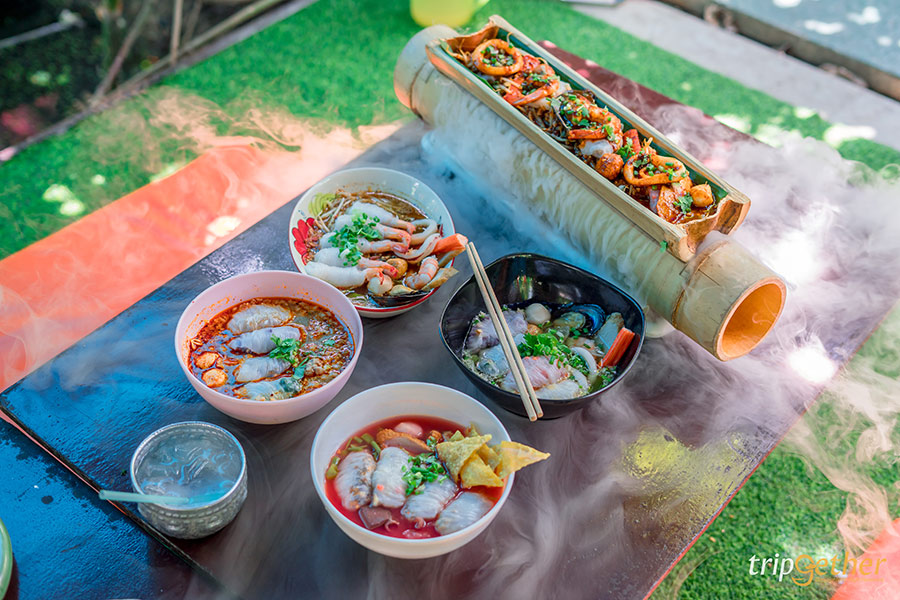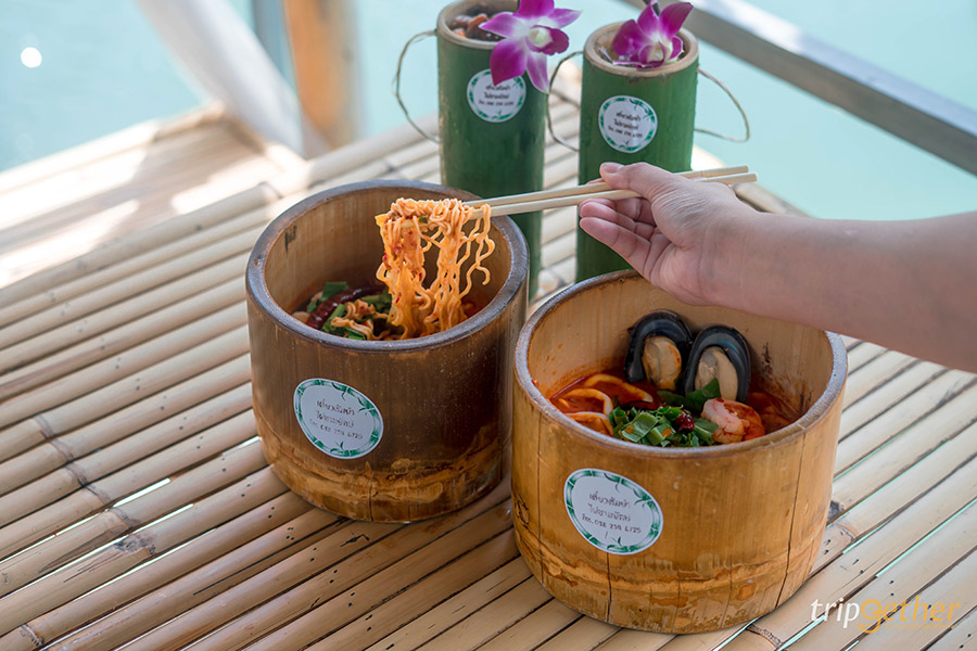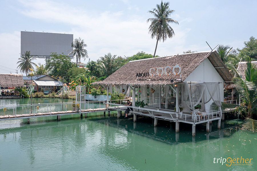 เตี๋ยวต้มยำไผ่ชามยักษ์@About coco ร้านก๋วยเตี๋ยวและคาเฟ่กลางน้ำสีฟ้าบรรยากาศสุดชิลล์ มีไฮไลท์อยู่ที่เมนูก๋วยเตี๋ยวของร้านเสิร์ฟมาในกระบอกไม้ไผ่ลำใหญ่ๆ ใส่เครื่องแบบจัดเต็ม แถมน้ำซุปยังรสเด็ดอีกด้วย ไม่เพียงแค่เมนูก๋วยเตี๋ยวเท่านั้นแต่ทางร้านยังมีเมนูอาหารคาว ของหวาน และเครื่องดื่มให้เลือกมากมาย เมนูแนะนำก็คือ ต้มยำหมู ต้มยำทะเล พล่ามะพร้าวอ่อน ผัดไทกุ้งสดเส้นน้ำมะพร้าว เมี่ยงคำปลาทับทิมทอด ชุดหมูสะเต๊ะ เมนูทอด 3 ทหารเสือ เซ็ตสุดคุ้มในจานบัว (ส้มตำไทย) น้ำสมุนไพรในกระบอกไม้ไผ่ ไอติมมะพร้าวอ่อนทรงเครื่อง เค้กช็อคโกแลตลาวาเยิ้ม เยิ้ม วาฟเฟิลชาร์โคลมะพร้าวอ่อน มะพร้าวปั่นนมสดลอดช่อง มะพร้าวปั่นนมสดทับทิมกรอบ ชานมไข่มุกบราวน์ชูก้ามะพร้าว และ About coco coffee ส่วนของโซนที่นั่งทางร้านมีให้เลือกถึง 4 โซน ไม่ว่าจะโซนกลางน้ำ โซนริมน้ำ โซนสวน และโซนห้องแอร์ แอบกระซิบว่าทางเข้าร้านให้สังเกตดีๆ จอดรถแล้วมองหาร้านข้าวมันไก่ และสามารถเดินเข้าทางเดียวกับร้านข้าวมันไก่ได้เลย