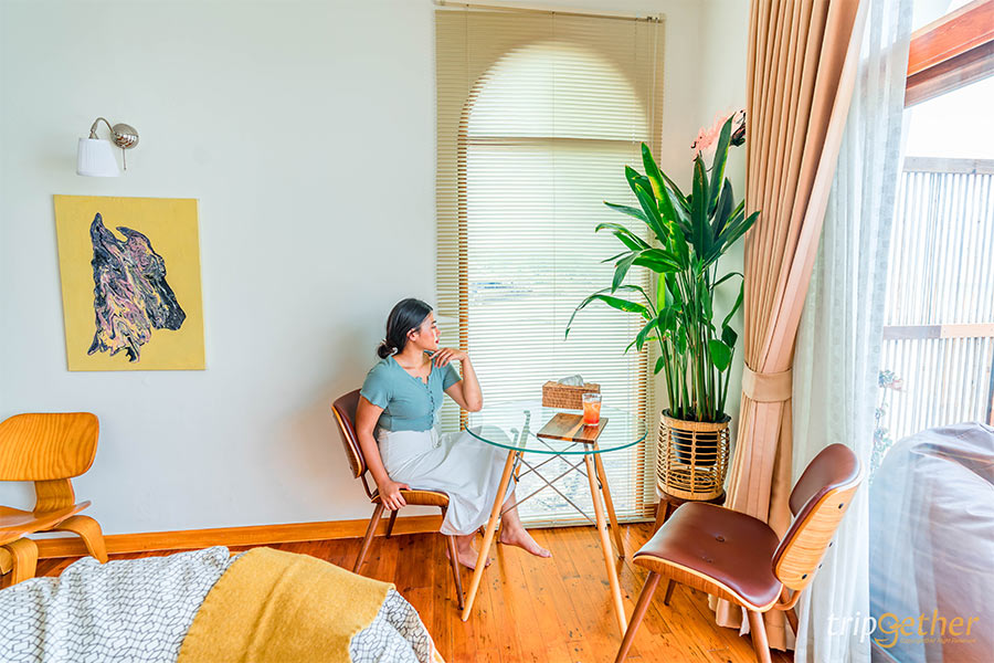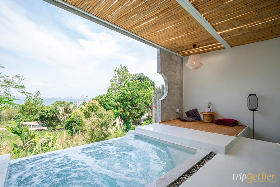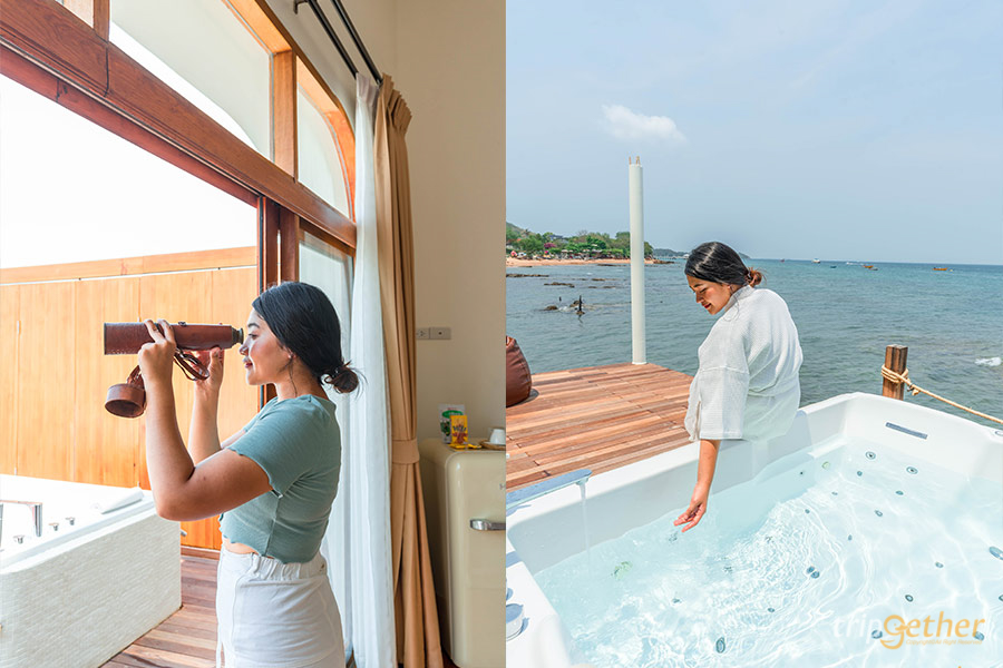 วางเวลา ที่พักเกาะล้านที่พร้อมจะให้คุณวางทุกอย่างลงแล้วมาดื่มด่ำกับบรรยากาศแสนพิเศษกับห้องพักสุดโรแมนติก ที่พร้อมมอบประสบการณ์ดีๆ ผ่านการออกแบบและการตกแต่งห้องพักที่มีชื่อว่า Jacuzzi Balcony Room ห้องพักสไตล์ Mid Century และ Modern Vintage ในยุค 70s – 90s ใช้สีออฟไวท์เป็นหลัก ตัดด้วยสีเหลืองมัสตาร์ด และสีแดงเปลือกมังคุด แต้มด้วยสีเขียวของต้นไม้ตามมุมห้องให้ความรู้สึกสดชื่นมีชีวิตชีวา ไฮไลท์คือมีมุมเทอเรสพร้อมอ่างจากุซซี่ส่วนตัว ซึ่งเป็นมุมยอดนิยมในการเช็คอิน เพิ่มความฟินด้วย Bubble bath ที่ทางที่พักมีบริการให้ฟรี ส่วนเฟอร์นิเจอร์ภายในห้องจะใช้ไม้เป็นหลัก ผสมผสานกับของเก่าสะสม ให้ความรู้สึกอบอุ่นอารมณ์บ้านในแถบ Plam Spring ใครจะมาพักที่นี่แนะนำให้จองมาก่อนล่วงหน้านะคะ