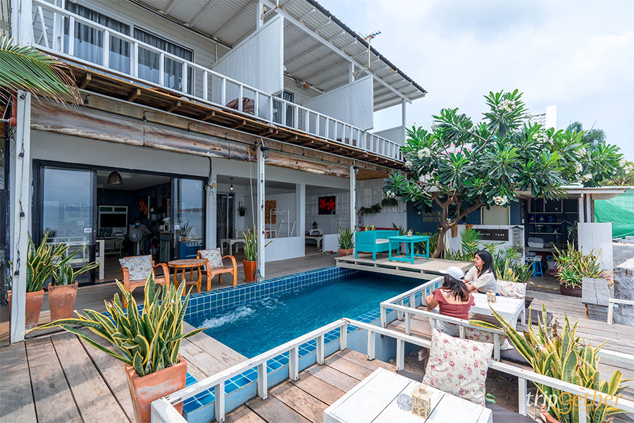 บ้านทะเลสวย อีกหนึ่งที่พักเกาะล้านที่ยื่นลงไปในทะเล รับลมทะเลได้แบบสดชื่นเต็มปอด ห้องพักมีทั้งหมด 8 ห้อง มีทั้งห้องที่พักได้เป็นคู่และเป็นกลุ่ม มีบริการมอเตอร์ไซค์ฟรี (1 คันต่อ 1 ห้องยกเว้นวันหยุดนักขัตฤกษ์) มีคันเบ็ดให้ตกปลาหน้าระเบียงที่พักส่วนกลางให้ตกปลากันแบบชิลล์ๆ นอกจากนี้พื้นที่ส่วนกลางยังสามารถรับประทานอาหาร รับลมชมวิวทะเลกันได้แบบ 180 องศา แถมยังมีสะพานเล็กๆ ยื่นออกไปในทะเลไว้ให้แชะภาพลงโซเชียลเก๋ๆ อีกด้วย