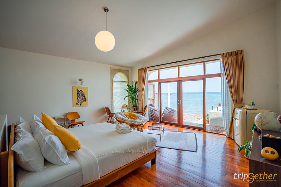 บ้านริมน้ำ ที่พักใกล้ท่าเรือหน้าบ้านแห่งนี้มาพร้อมบรรยากาศสุดชิลล์ เหมาะสำหรับคนที่กำลังมองหาที่พักฟีลสบายๆ สไตล์บังกะโล โดยห้องพักทั้งหมดมี 20 ห้อง แบ่งเป็น 5 แบบ ภายในตกแต่งอย่างเรียบง่ายสไตล์โมเดิร์น เน้นสีโทนสว่างพร้อมเฟอร์นิเจอร์และสิ่งอำนวยความสะดวกครบครัน ด้านของตกแต่งเป็นเปลือกหอยขนาดเล็กใหญ่จากธรรมชาติ ดูแล้วเข้ากับบรรยากาศท้องทะเลอย่างลงตัว อีกทั้งยังมีมุมระเบียงหน้าห้องพร้อมเปลตาข่ายให้นอนเล่นชมวิวตลอดทั้งวัน เป็นอีกหนึ่งที่พักบนเกาะล้านที่น่าสนใจ อย่าลืมลิสต์ที่นี่เอาไว้รับรองไม่ผิดหวัง!