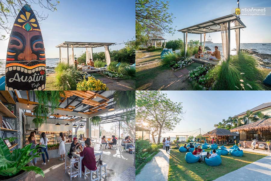 ออสติน คาเฟ่ ร้านนี้โดดเด่นด้วยบรรยากาศสุดชิลล์ ที่ตั้งอยู่ริมชายหาดสุดเงียบสงบ แถมยังแวดล้อมไปด้วยต้นไม้สีเขียวที่รับรองว่าให้ฟีลลิ่งไม่เหมือนที่ไหน ตัวร้านมาในดีไซน์แบบโมเดิร์นอินดัสเทรียล ที่มาในรูปแบบโอเพ่นเปิดรับลมผ่านทะลุตลอดทั้งวัน มากมายด้วยมุมนั่งและจุดถ่ายรูป ซึ่งช่วงเย็นจะมีแสงอาทิตย์มาวิบวับกระทบกับผืนน้ำให้ชม พร้อมชิมเมนูอร่อยๆ ที่เสริฟทั้งของคาวทั้งไทย เบเกอรี่ และเครื่องดื่มเย็นๆ รวมถึงยังมีค็อกเทลให้จิบกันด้วย