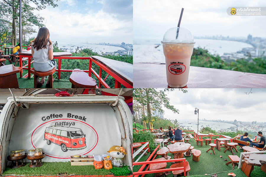 คอฟฟี่ เบรค พัทยา คาเฟ่เล็กๆ ที่ตั้งอยู่บนเขาพระตำหนัก ใกล้อนุสาวรีย์กรมหลวงชุมพรเขตอุดมศักดิ์ มีรถตู้ Volksvagen เป็นสัญลักษณ์ของร้าน สำหรับตัวร้านจะเป็นร้านแบบ Open Air ที่ไม่ว่าจะนั่งมุมไหนของตัวร้านก็สามารถรับลมทะเลได้อย่างเต็มที่ สำหรับเมนูก็มีให้เลือกทั้งเครื่องดื่มและเมนูทานเล่น ซึ่งรับรองได้เลยว่าอร่อยเกินราคาอย่างแน่นอน