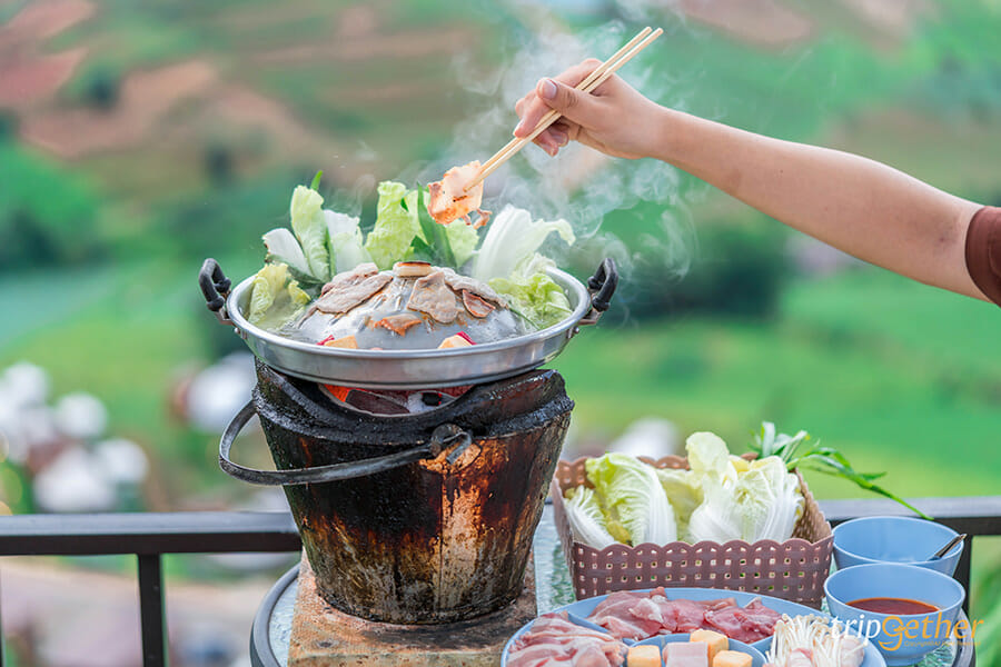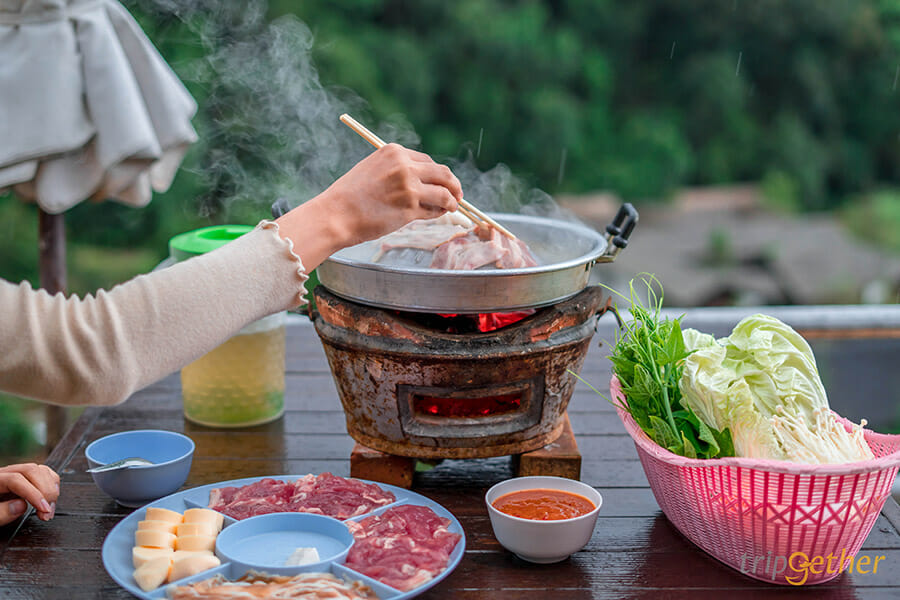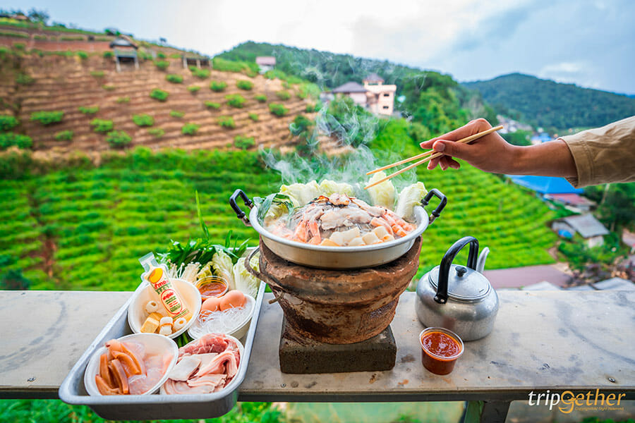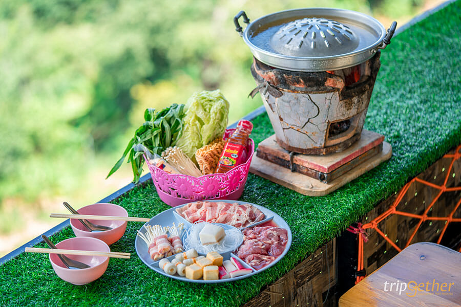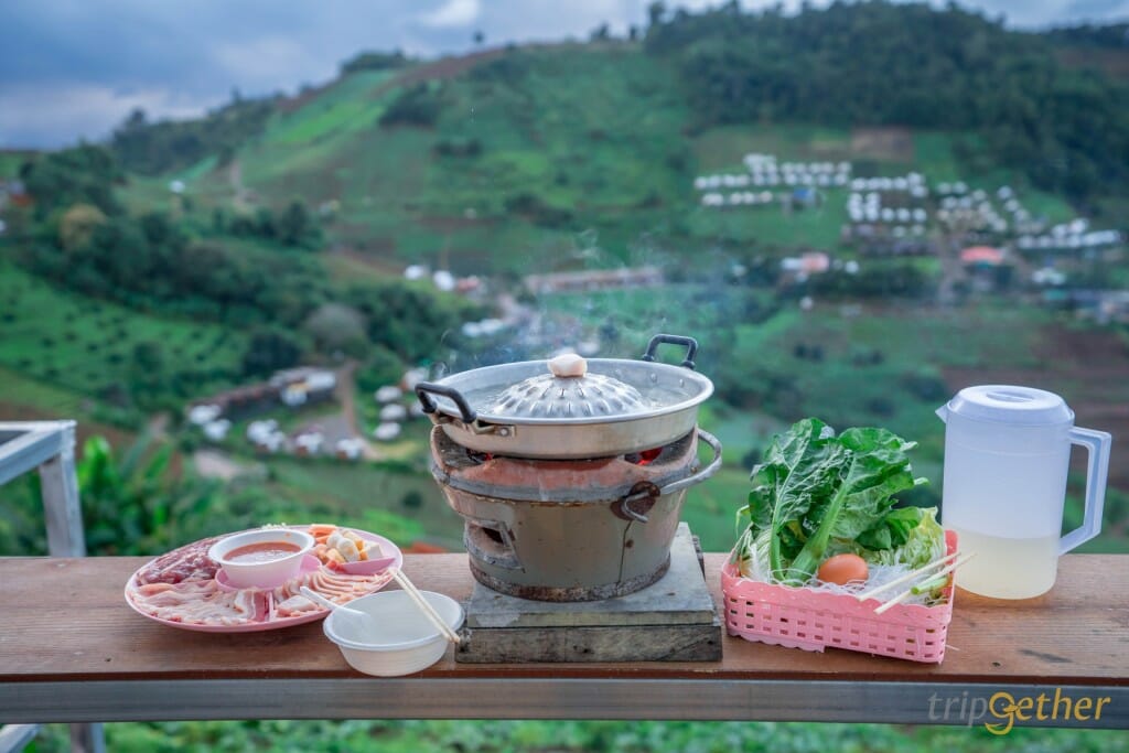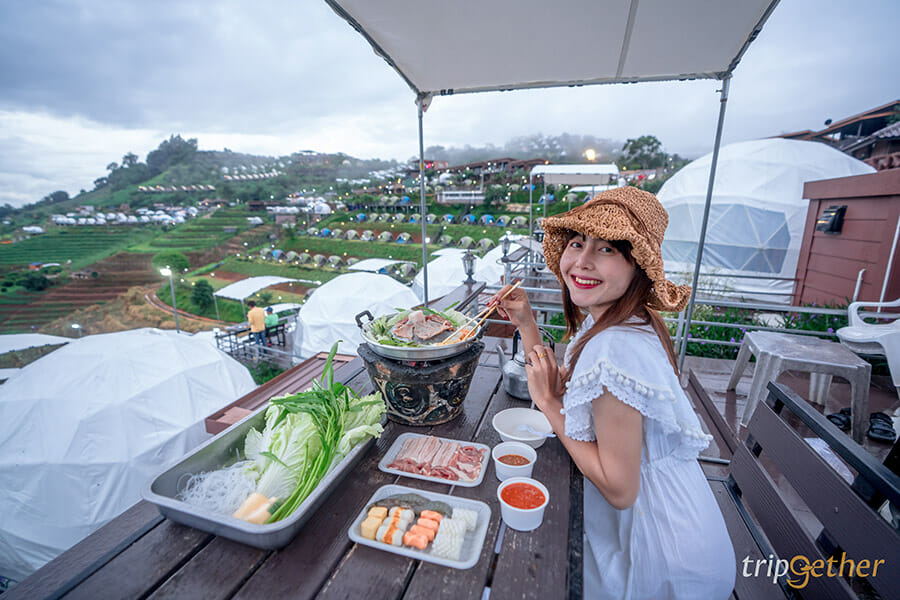 ภูแสงเทียน โฮมสเตย์ ที่พักบรรยากาศอบอุ่นบนม่อนแจ่ม ที่รอให้ทุกคนได้มาสัมผัสกับธรรมชาติ และพักผ่อนกันอย่างเต็มที่ ที่พักของภูแสงเทียนโฮมสเตย์มีให้เลือก 3 แบบ คือบ้านพักไม้ไผ่ที่มีกระจกใสบานใหญ่ให้สามารถมองวิวด้านนอกได้ในห้อง หรือว่าใครชอบสไตล์แคมป์ปิ้งก็มีห้องแบบคือเต็นท์โดม และเต็นท์กระโจมให้เลือกกันด้วย มาม่อนแจ่มทั้งทีจะพลาดการกินหมูกระทะบนดอยได้ยังไง และที่นี่ก็มีบริการชุดหมูกระทะและชุดหมูย่างให้นั่งปิ้งย่างกันแบบฟินๆ ไปเลย ยังไม่หมดเท่านี้ เพราะที่ภูแสงเทียนโฮมสเตย์ปลูกผักให้เราได้เก็บมากินกันแบบสดๆ ได้ด้วย อย่างเช่น ผักสลัด โรสแมรี่ และส้ม ใครอยากได้ความเป็นส่วนตัว พักผ่อนอย่างเต็มที่ ภูแสงเทียน โฮมสเตย์ จะเป็นที่พักที่เหมาะกับคุณแน่นอน