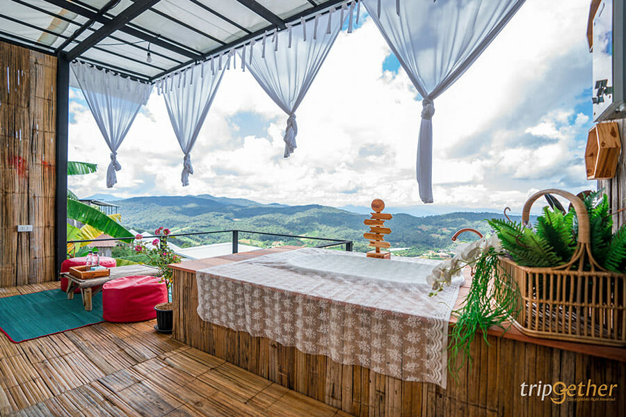 ภูเขาลอยเมฆ หรือ Moutain Cloud ที่พักเชียงใหม่บนดอยบรรยากาศสุดว้าวที่ตั้งอยู่ อ.แม่แตง ความสวยงามก็คือภาพของเมฆหมอกที่ลอยปกคลุมยอดเขาในยามเช้า รวมทั้งความเขียวขจีและความสดชื่นของแมกไม้ จึงเป็นที่มาของชื่อที่พัก ภูเขาลอยเมฆ มีห้องพักให้เลือก 2 แบบด้วยกัน คือห้องพักแบบพูลวิลล่า ที่มีสระว่ายน้ำส่วนตัววิวภูเขาสุดชิลล์อยู่ด้านหน้าห้อง และห้องพักแบบแกลมปิ้งที่มาพร้อมกับความสะดวกสบาย และมีเฟอร์นิเจอร์ครบครัน อีกทั้งยังมีเปลตาข่ายให้เอนกาย ถ่ายรูปสวยๆ อีกด้วย