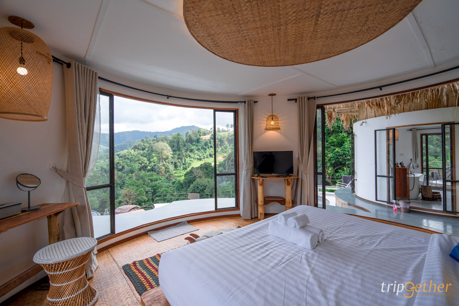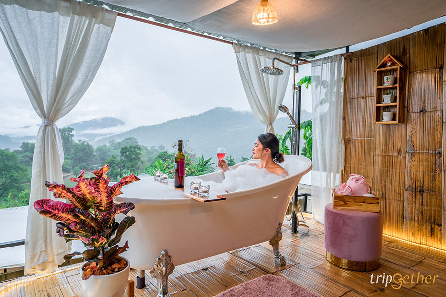 เจอเขาโฮมสเตย์ ที่พักบรรยากาศดีขั้นสุดอีกแห่งหนึ่งของแม่แตง ที่มาพร้อมกับการตกแต่งด้วยสไตล์แคมป์ปิ้ง เน้นใช้วัสดุจากธรรมชาติอย่างไม้ไผ่ มีให้เลือก 2 แบบทั้งแบบกระโจมที่มีอ่างอาบน้ำสุดฟินด้านหน้าให้ได้นอนตีฟองสบู่ ถ่ายรูปสวยๆ มีหลอกและภูเขาสุดกรีนเป็นฉากหลัง และห้องพักกระโจมแบบไม่มีอ่างอาบน้ำ แต่ก็จัดเต็มความสะดวกสบายขั้นสุด บอกเลยว่าสายคอนเทนต์ทั้งหลายที่มาเที่ยวเหนือ ต้องแวะเข้ามาเช็คอิน นอนฟินกันสักคืนนะ