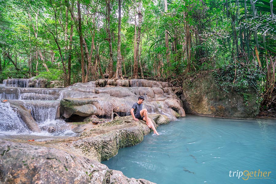 น้ำตกเอราวัณ น้ำตกที่ตั้งอยู่ในพื้นที่ของอุทยานแห่งชาติเอราวัณ น้ำตกชื่อดังของกาญจนบุรีที่มีความสวยงามและโดดเด่นของสีน้ำ ที่ออกเป็นสีฟ้าใส สามารถมองเห็นหมู่ปลา และพื้นน้ำเบื้องล่าง โดยมีทั้งหมด 7 ชั้น ได้แก่ ไหลคืนรัง, วังมัจฉา, ผาน้ำตก, อกผีเสื้อ, เบื่อไม่ลง, ดงพฤกษา และภูผาเอราวัณ ซึ่งสามารถลงแช่น้ำใสๆ เย็นๆ ได้แบบสบายใจ นอกจากนี้ยังมีกิจกรรมศึกษาเส้นทางธรรมชาติอีกด้วย