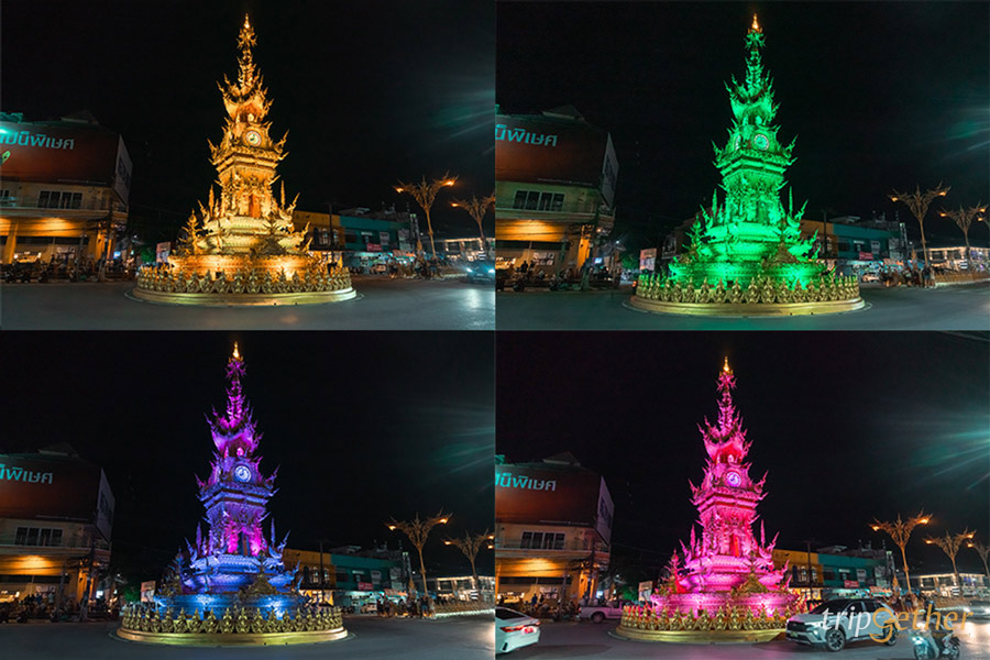 หอนาฬิกาเชียงราย ที่เที่ยวเชียงรายที่เป็นไฮไลท์ในยามค่ำคืน ลักษณะของหอนาฬิกามีความสวยงามอลังการด้วยประติมากรรมปูนปั้นแบบฉบับที่เป็นเอกลักษณ์ของ อ.เฉลิมชัย ตั้งตระหง่านอยู่กลางวนเวียนถนน จุดเด่นของหอนาฬิกาก็คือในทุกคืนช่วงเวลา 19.00 น., 20.00 น. และ 21.00 น. จะมีการแสดงแสงสีเสียง โดยมีการเปิดเพลงพร้อมกับสลับแสงไฟเป็นสีต่างๆ อย่างสวยงาม