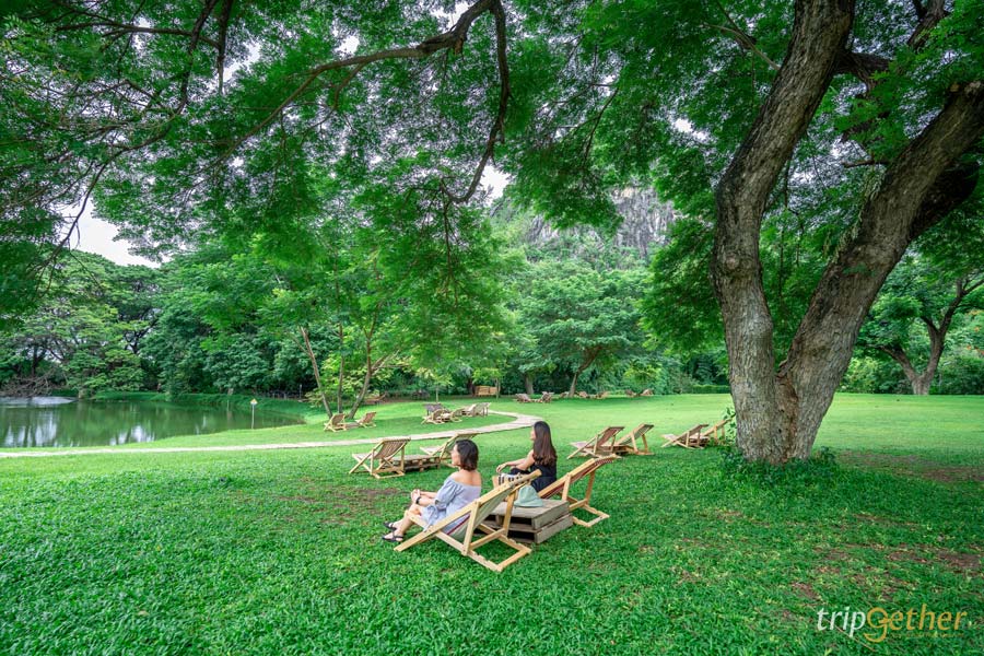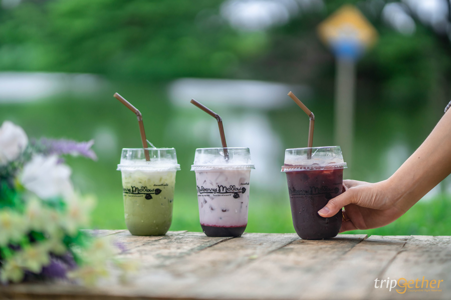 Mulberry Mellow คาเฟ่ฟีลดียอดฮิตของกาญจนบุรี เพราะนอกจากจะมีพื้นที่เป็นทุ่งหญ้ากว้างสีเขียวขจีแล้วยังมีต้นไม้ใหญ่มากมายที่คอยให้ร่มเงา สระน้ำที่ให้ความเย็นสบาย รวมทั้งแนวทิวเขาที่เหมือนเป็นฉากหลังของคาเฟ่แห่งนี้ ที่นั่งของร้านที่ไม่ว่าใครมาก็ต้องจัดเลยก้คือที่นั่งเอาท์ดอร์กลางแจ้งที่กระจายกันอยู่ทั้งในทุ่งหญ้าและใต้เงาไม้ริมน้ำ ซึ่งมีทั้งแบบเป็นเก้าอี้นอนและเสื่อนั่งปิกนิก บอกเลยว่าถูกใจสายชิลล์อย่างเราๆ เป็นที่สุด