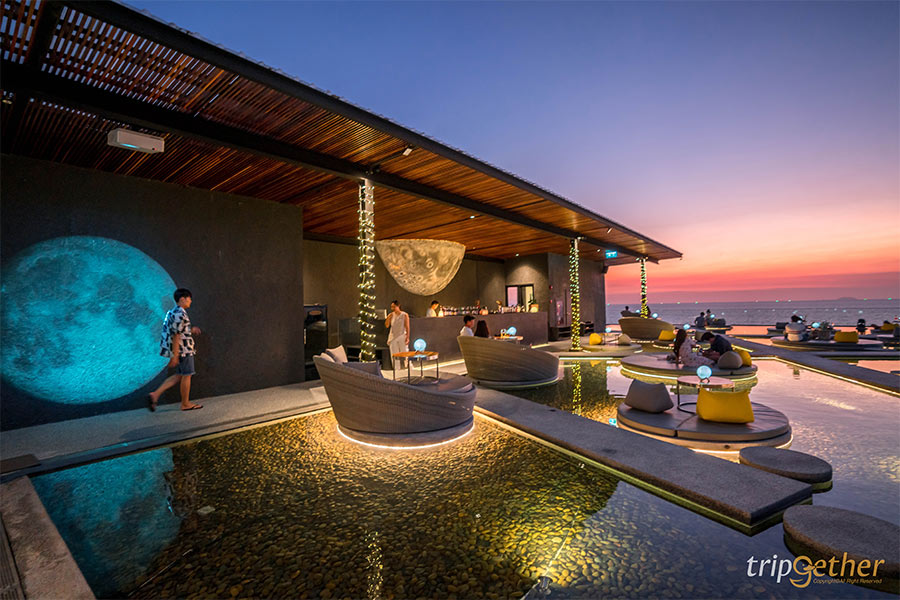 Over The Moon รูฟท็อปบาร์บนดาดฟ้าในที่พักสุดหรูอย่าง ANA ANAN Resort & Villas Pattaya เป็นลักษณะ Lounge บนชั้นดาดฟ้ามองเห็นวิวทะเลแบบ 180 องศา โอเวอร์เดอะมูนโดดเด่นด้วยที่นั่งกลางน้ำชมวิวแสงทไวไลท์แบบฟินๆ เคล้าด้วยเครื่องดื่มสุดชิลล์เข้ากับบรรยากาศ ซึ่งมีเมนูซิกเนเจอร์อย่าง Ana Secret เป็น Beertail สูตรลับของอาณาอานันท์ Twilight เป็น Mocktail สีสันสดใสน่าลิ้มลอง Deep Fired Cheese Stick เป็นชีสแท่งชุบเกร็ดขนมปังทอดกับซอสค็อกเทลและ Parma Ham & Melon จิบม็อกเทลชิมของอร่อยๆ พร้อมวิวสุดปังแบบนี้เอาอะไรมาแลกก็ไม่ยอม