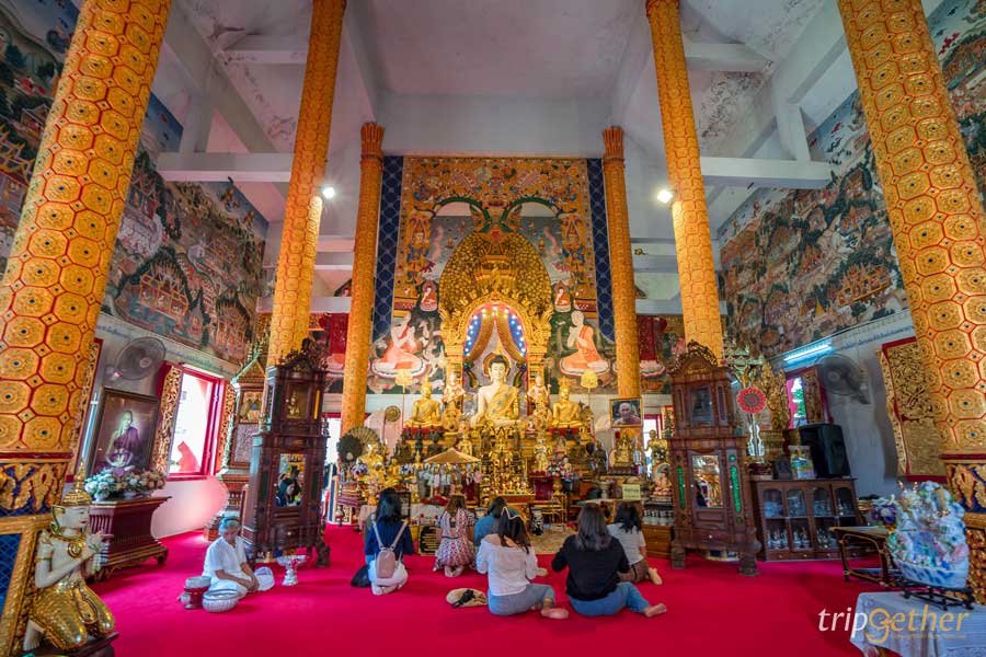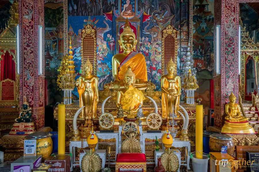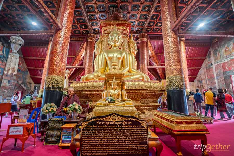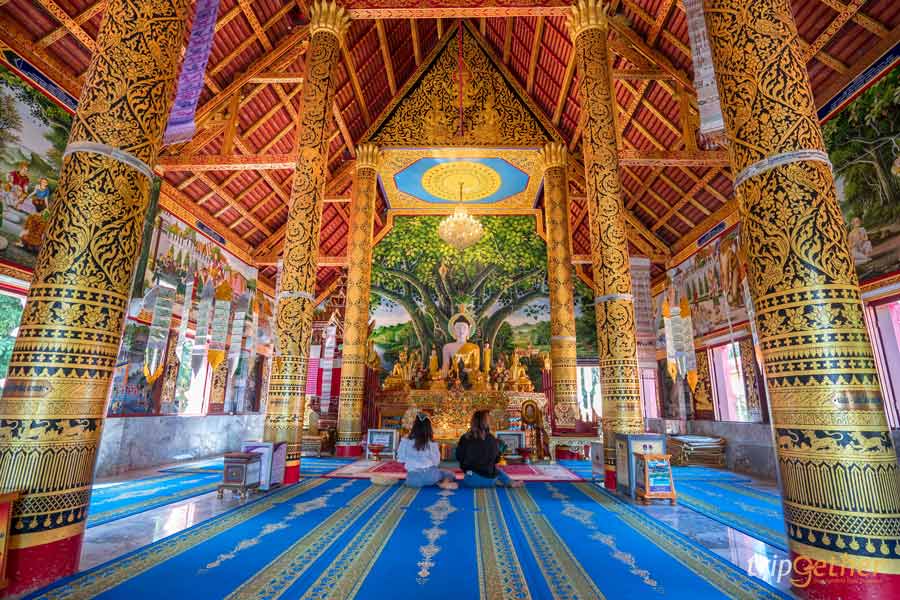 พามาชมอีกหนึ่งวัดสวยที่โดดเด่นด้วยสีทองอร่าม สวยสะดุดตาระยิบระยับมาก อย่าง วัดศรีพันต้น มีจิตรกรรมปูนปั้นที่สวยงามโดยเฉพาะ พญานาค 7 เศียร อยู่บริเวณบันไดหน้าวิหารวัดซึ่งสถาปัตยกรรมอันงดงามนี้ปั้นแต่งโดยช่าง ชาวน่านชื่อ นายอนุรักษ์ สมศักดิ์ หรือ สล่ารง ในส่วนของด้านในวิหารมีภาพเขียนลายเส้น งานจิตรกรรมบอกเล่าเรื่องราวเกี่ยวกับพระพุทธเจ้าให้ได้ชมด้วย