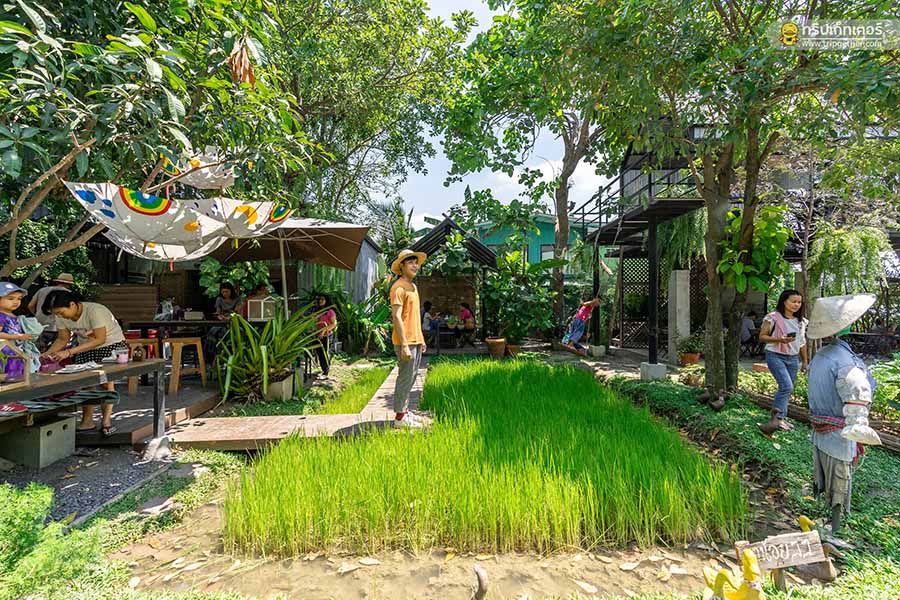 บ้าน 1000 ไม้ คาเฟ่ แอนด์ ฟาร์ม แค่ฟังชื่อก็พอเดาได้ถึงความกรีนและความสุขที่จะได้รับ ที่นี่เป็นคาเฟ่สไตล์บ้านนาขนาด 3 ไร่ โซนคลองบางเตย เดินเข้ามาจะพบกับโซนคาเฟ่ก่อน มีมุมนั่งและบ้านต้นไม้ให้ถ่ายรูเช็คอินกัน ส่วนด้านในจะเป็นฟาร์มและบ่อน้ำ โดยทุกคนสามารถลงมือดำนา พายเรือ ทำกิจกรรมได้อย่างอิสระ แต่ไม่ต้องกลัวเปื้อน เพราะมีมุมให้อาบน้ำ ส่วนเมนูนั้นก็ครบ เครื่องดื่ม ของหวาน อาหารคาว เมนูง่ายๆ เข้ากับบรรยากาศ รับรองว่าถูกใจทั้งครอบครัว