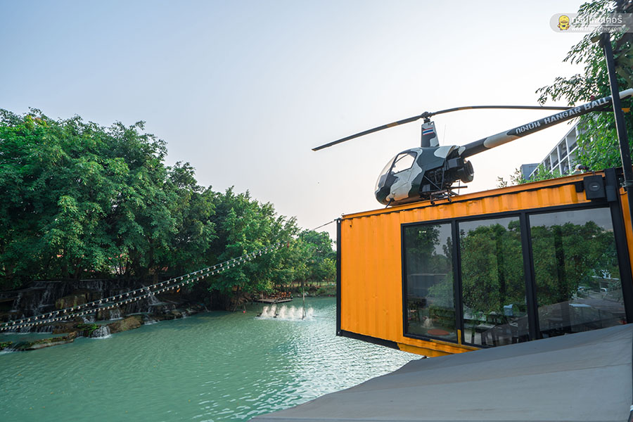 แฮงก้า คาเฟ่ ร้านนี้โดดเด่นในเรื่องของสไตล์ที่แตกต่าง มาในตีมของโรงเก็บเครื่องบิน ตัวร้านแบ่งออกเป็น 2 โซนด้วยกันก็คือ โซนคาเฟ่ที่มาในดีไซน์เท่ๆ ดัดแปลงจากตู้คอนเทนเนอร์ ซึ่งเป็นจุดสำหรับสั่งเมนูอร่อย ที่บริการทั้งเครื่องดื่ม ของหวาน และเมนูทานเล่นซะส่วนใหญ่ ถัดไปด้านในจะเป็นมุมนั่งบรรยากาศริมน้ำตก ซึ่งความพิเศษของที่นี่คือน้ำจะใสและเป็นสีฟ้าแบบมรกต แต่ก็ยังไม่ทิ้งความเท่ในมุมต่างๆ มีเรือรบ เครื่องบินให้ถ่ายรูปกัน ส่วนอีกหนึ่งโซนจะห้องโถงขนาดใหญ่ จำลองให้เหมือนฐานทัพ มากมายด้วยไอเทมเท่ๆ แถมยังมีมุมให้ช้อปปิ้งซื้อกลับไปแต่งบ้านกันอีกด้วย