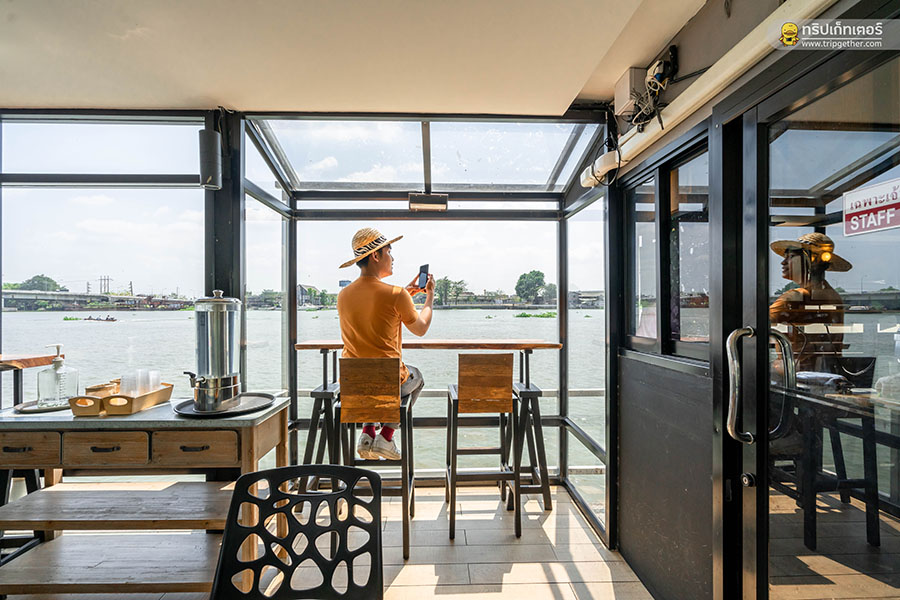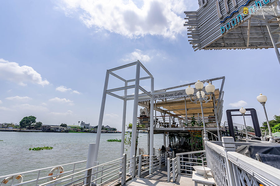 ออน เดอะ ริเวอร์ คาเฟ่ ร้านกาแฟสุดน่ารัก ที่โดดเด่นด้วยโลเคชั่นริมแม่น้ำเจ้าพระยา และตัวร้านเป็นเรือโป๊ะสีขาวดูเข้ากันกับรรยากาศ ภายในมีมุมให้เลือกนั่งทั้งในห้องแอร์ และโซนรับลมแบบโอเพ่นบนชั้นสอง ที่คุณสามารถชมวิถีชีวิตกันได้แบบกว้างๆ ส่วนเมนูก็มีให้เลือกมากมายทั้งเครื่องดื่มและเบเกอรี่ ที่สำคัญในโซนติดกันยังมีร้านอาหาร บ้านเหนือน้ำ ที่เสริฟเมนูอาหารไทยเมนูเด็ด ให้เลือกชิมกันด้วยกันด้วย เรียกว่ามาทีเดียวได้ถึงสอง ชิลล์ลากยาวตั้งแต่บ่ายไปถึงช่วงเย็นกันเลย