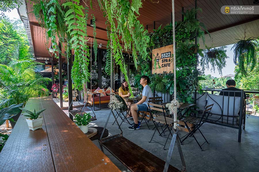 5522 สปา & คาเฟ่ คาเฟ่บรรยากาศชิลล์ๆ ที่ได้ชื่อร้านมาจากเลขที่บ้าน ตัวร้านมีขนาดกรทัดรัดตั้งอยู่ท่ามกลางต้นไม้ที่ร่มรื่นและยังมีสระบัวให้นั่งกินลมชมวิวกันแบบเพลินๆ และแบ่งเป็น 2 โซนคือ โซนห้องแอร์และโซนเอ้าท์ดอร์ สำหรับเมนูเครื่องดื่มก็มีทั้งเมนูชา กาแฟ และอิตาเลี่ยนโซดา และยังมีเมนูเบเกอรี่เอาใจสายหวานอีกด้วย และที่พลาดไม่ได้เลยก็คือ เค้กมันม่วง เค้กเนื้อนุ่มที่เสิร์ฟในกล่องไม้สุดน่ารัก