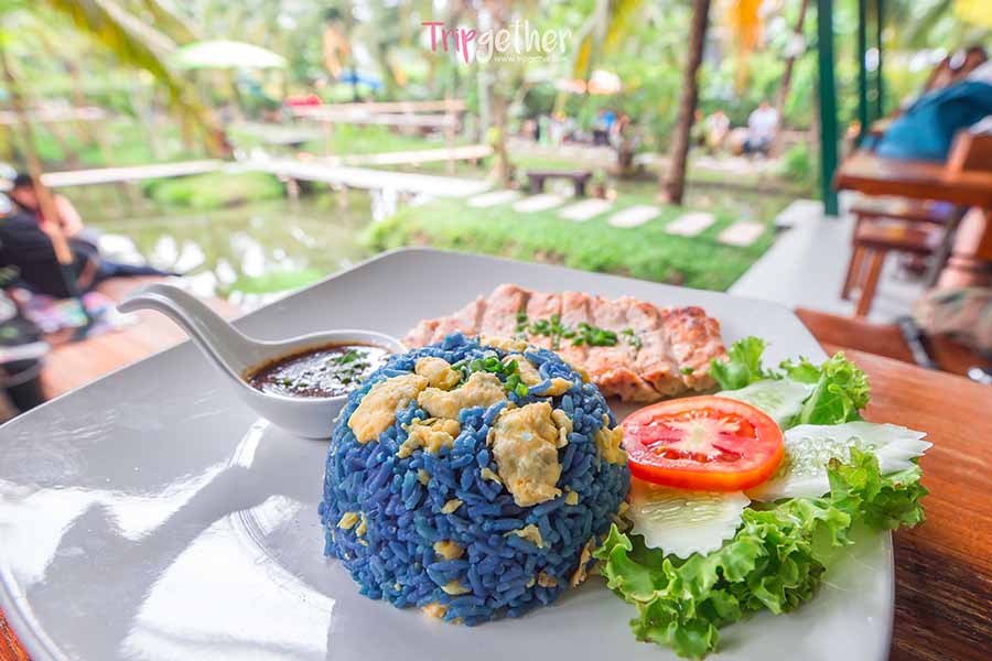 โอทู คาฟเฟ่ แอนด์ บิสโทร ร้านคาเฟ่กลางสวนมะพร้ามที่ใครหลายคนคงเคยผ่านตากันมาบ้าง ด้านหน้าจะเป็นโซนเคาน์เตอร์สำหรับออเดอร์เมนู มีมุมให้นั่งเล็กๆ ส่วนมุมไฮไลท์จะอยู่ด้านใน เป็นท้องร่องมากมายด้วยต้นไม้บรรยากาศกรีนๆ มีโต๊ะที่ทำเหมือนท่าน้ำ ให้นั่งกินลม กินอาหรกันอย่างสบายใจ ส่วนเมนูเด็ดที่มาแล้วไม่สั่งไม่ได้ คือ ข้าวผัดดอกอัญชัน ที่เสริฟพร้อมหมูย่างและซอสจิ้มแจ่ว ทานคู่กันเข้ากับบรรยากาศสุดๆ