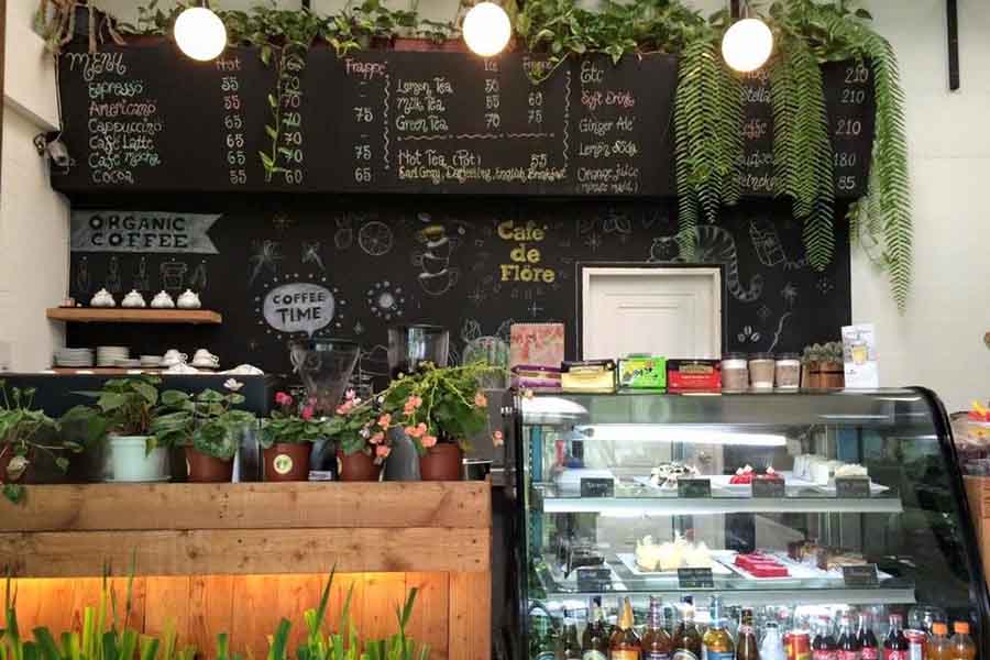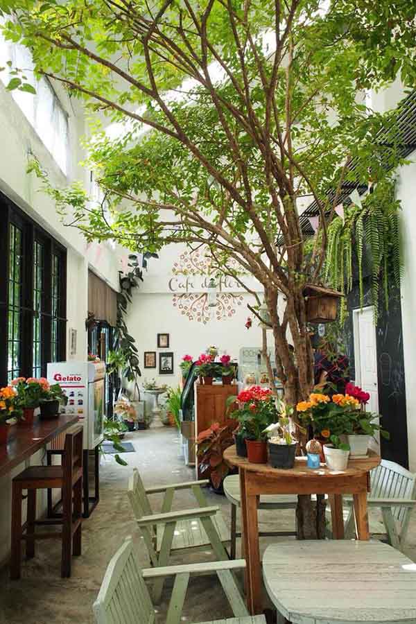 คาเฟ่ เดอ ฟลอร์ ร้านคาเฟ่เล็กๆ ที่มีดีตรงบรรยากาศ ตัวร้านเป็นห้องเล็กๆ หลังคาสูงโปร่ง ใจกลางห้องมีต้นไม้ขนาดกลางๆ คอยบังแสงแดดอ่อนๆ ที่ทอดมาช่วงบ่าย บรรยากาศสุดโรอมนติก มุมต่างๆ ตกแต่งได้อย่างเรียบง่ายสะอาดตา มีมุมโต๊ะให้เลือกนั่งไม่เยอะ จึงไม่อีดอัด ส่วนเมนูนั้นก็มีให้เลือกทั้งคาว หวาน รวมถึงมีเซ็ตชาให้มาจิบยามบ่ายแบบผู้ดีๆ กันด้วย
