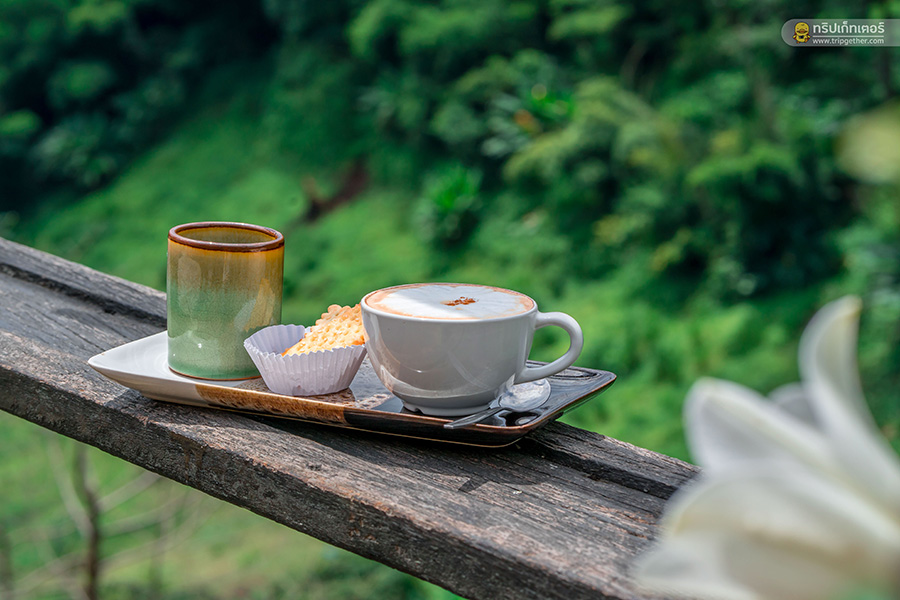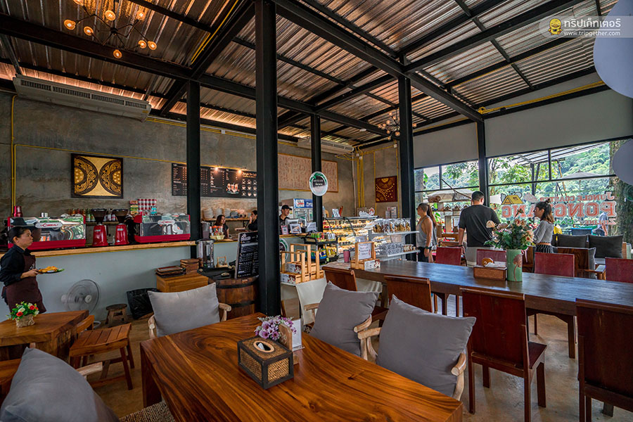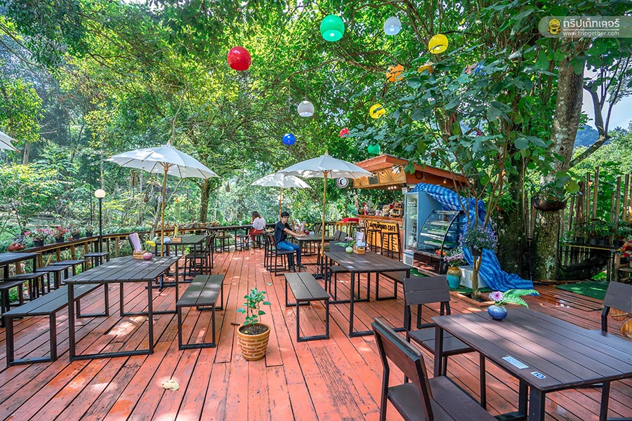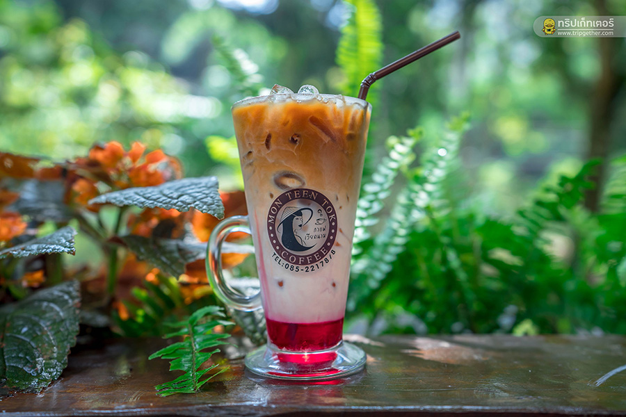 คาเฟ่ชิลล์ๆ ตั้งอยู่บนเนินเขาเล็กๆ ท่ามกลางธรรมชาติ ตัวร้านตกแต่งเรียบง่ายด้วยวัสดุกลมกลืนกับธรรมชาติโดยรอบได้เป็นอย่างดี มีโซนให้เลือกนั่งทั้งโซนระเบียงโล่งใต้ต้นไม้ใหญ่สุดร่มรื่นให้นั่งรับลมเย็นในบรรยากาศสบายๆ และตัวร้านยังประดับตกแต่งด้วยโคมไฟหลากสีช่วยเติมสีสันสดใสให้ความเก๋เข้ากันได้ดีกับตัวร้าน นอกจากนี้ยังมีโซนบ้านไม้ไผ่ที่ภายในตกแต่งด้วยไม้ไผ่สาน ทั้งผนัง เฟอร์นิเจอร์ และส่วนอื่นๆ ของตัวร้านเน้นความเรียบง่ายสวยงามดีทีเดียว สำหรับเมนูเครื่องดื่มที่อยากแนะนำเลยก็คือ กาแฟที่ได้สูตรการชงจากเวียดนามแท้ที่ให้รสชาติกาแฟที่เข้มข้นหอมไม่เหมือนใคร และยังมีกาแฟม่อนตีนตก ชาเขียวมัทฉะนมสด ลาเต้ม่อนตีนตก มันม่วงนมสด และเค้กมะพร้าวที่แนะนำให้สั่งมาลิ้มลองกันเมื่อไปเยือนที่ ม่อนตีนตก
