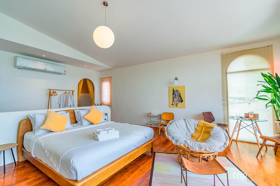เหนื่อยจากวันทำงานแล้วอยากพักผ่อนนอนฟังเสียงคลื่นเชิญมาที่ วางเวลา ที่พักริมทะเลบนเกาะล้านที่อยากชวนทุกคนมาวางความทุกข์กายทุกข์ใจ วางปัญหาทุกสิ่ง วางชีวิตประจำวัน แล้วมาปล่อยให้ร่างกายได้พักผ่อนนอนชิลล์แบบไม่เร่งรีบดื่มด่ำวิวทะเล นอนแช่อ่างจากุซซี่ตีฟองนุ่มๆ ใช้เวลาในห้องพักให้เต็มที่ในวันหยุดอันแสนเงียบสงบ ที่วางเวลาได้ออกแบบและตกแต่งห้องพักที่มีชื่อว่า Jacuzzi Balcony Room ด้วยสไตล์ Mid Century และ Modern Vintage ที่เน้นใช้โทนสีออฟไวท์เป็นหลัก มีสีน้ำตาล สีเหลืองมัสตาร์ดจากของตกแต่งห้องมาตัดได้อย่างลงตัว และยังมีสีเขียวของต้นไม้ตามมุมห้องที่ให้ความรู้สึกมีชีวิตชีวา อีกทั้งภายในห้องพักยังเป็นพื้นไม้ เฟอร์นิเจอร์ไม้ และกรอบประตูไม้ที่บอกเลยว่าคลาสสิกสุดๆ แอบกระซิบว่าใครเข้าพักที่วางเวลาแห่งนี้สามารถเตรียมชุดมาได้แบบไม่อั้น เพราะทุกมุมห้องทั้งด้านในห้องนอนไปจนถึงระเบียงห้องที่ติดทะเลนั้นถ่ายรูปสวยทุกมุม