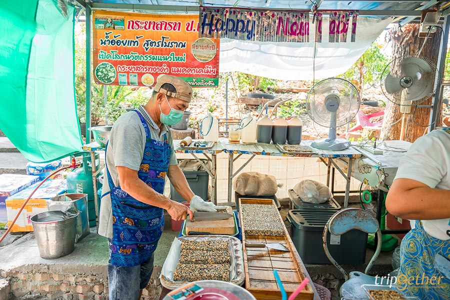 แวะซื้อขนมโคและขนมเล็บมือนาง กล่องละ 50 บาท