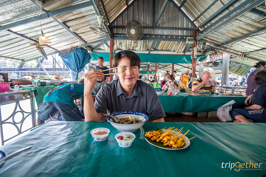 มื้อเที่ยงฝากท้องไว้ที่ตลาดน้ำตลิ่งชันนี่เลย นั่งกินบนแพชิลล์ๆ สั่งก๋วยเตี๋ยวเนื้อน้ำตก ราคา 60 บาท กับชุดหมูสะเต๊ะ 15 ไม้ 90 บาท มากินอร่อยมาก!