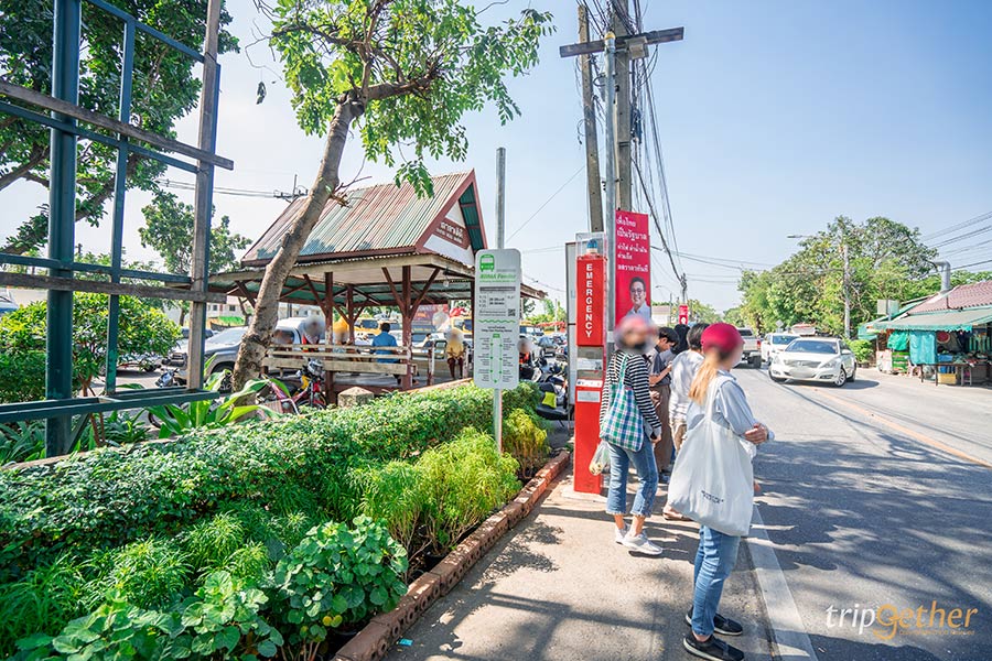 เจอป้ายแบบนี้ก็ยืนรอรถได้เลย แอบกระซิบว่าใครอยากนั่งเรือเที่ยวชมวิถีชีวิตริมคลองในเขตตลิ่งชันที่ตลาดมีบริการเรือพาทัวร์ตลาดน้ำตลิ่งชัน – วัดเกาะ ด้วยนะ