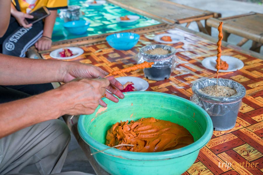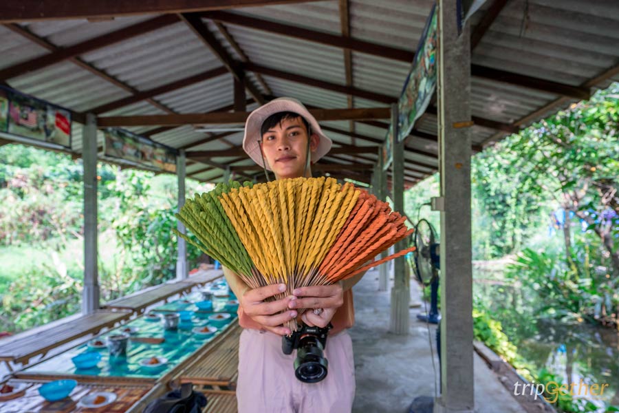 ปิดท้าย กิจกรรมที่ต้องทำเมื่อไปเที่ยวบางกะเจ้า ด้วยกันพาเพื่อนๆ ทุกคนมา ทำธูปหอมและผ้ามัดย้อม เป็นอีกกิจกรรมยอดฮิตของบางกะเจ้า โดยแต่ละชุมชนก็จะหยิบเอาวัตถุดิบในพื้นที่ของตัวเอง อย่างเช่น เปลือกลูกจาก ฝักคูน ใบของมะม่วงน้ำดอกไม้เขียวนวลพันธุ์มะม่วงท้องถิ่นของบางกะเจ้าที่นำมาสกัดเป็นสีย้อมผ้า โดยเราก็จะได้ผ้ามัดย้อมสีธรรมชาติอันมีเอกลักษณ์ผืนเดียวในโลกมาไว้เป็นที่ระลึก ในส่วนของการทำธูปหอมสมุนไพรไล่ยุงก็เช่นเดียวกัน จะเลือกใช้สมุนไพรพื้นบ้านที่หลากหลาย ไม่ว่าจะเป็น ตะไคร้หอม มะกรูด และอบเชย แต่ละขั้นตอนจะมีเจ้าของบ้านคอยดูแลและให้คำแนะนำตลอดทั้งกิจกรรม บอกเลยว่าเป็นกิจกรรมที่ใครมาเที่ยวบางกะเจ้าต้องแวะมาใช้เวลาสนุกๆ ร่วมกันที่นี่เลย
