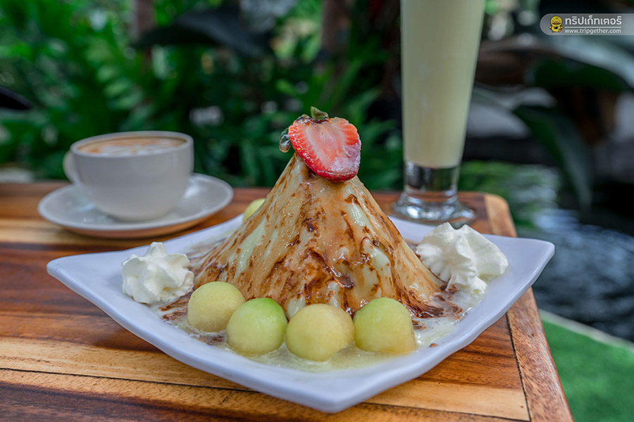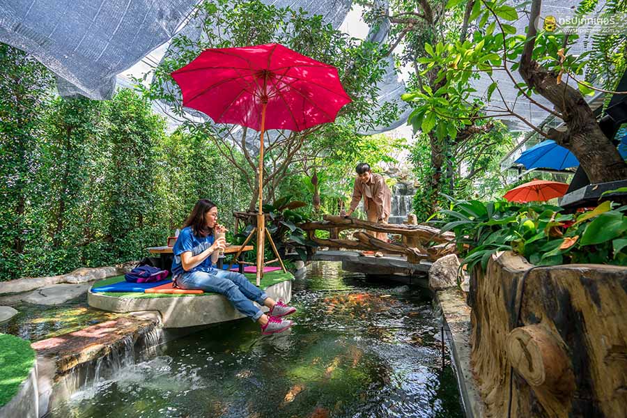 Sangtawanfarm Melon ฟาร์มเมล่อนที่ปลูกด้วยมือ ดูแลด้วยใจ รวมทั้งเป็นร้านอาหารและคาเฟ่ที่บรรยากาศภายในอบอุ่นและเต็มไปด้วยความร่มรื่นของพันธุ์ไม้ มีปลาคาร์ปมากมายแหวกว่ายผ่านธารน้ำที่ไหลมาจากน้ำตกจำลอง เพิ่มอารมณ์สุนทรีในการพักผ่อนได้เป็นอย่างดี โต๊ะที่นั่งมีหลายจุดให้เลือกพัก ด้านเมนูก็มีครบทั้งคาวหวาน ที่แนะนำเลยคือหลากหลายเมนูเมล่อน ทั้งน้ำเมล่อนสด, เค้กเมล่อน และ ‘ฟูจิแสงตะวัน’ บิงซูเมล่อนสดๆ จากฟาร์ม หอมอร่อยชื่นใจ