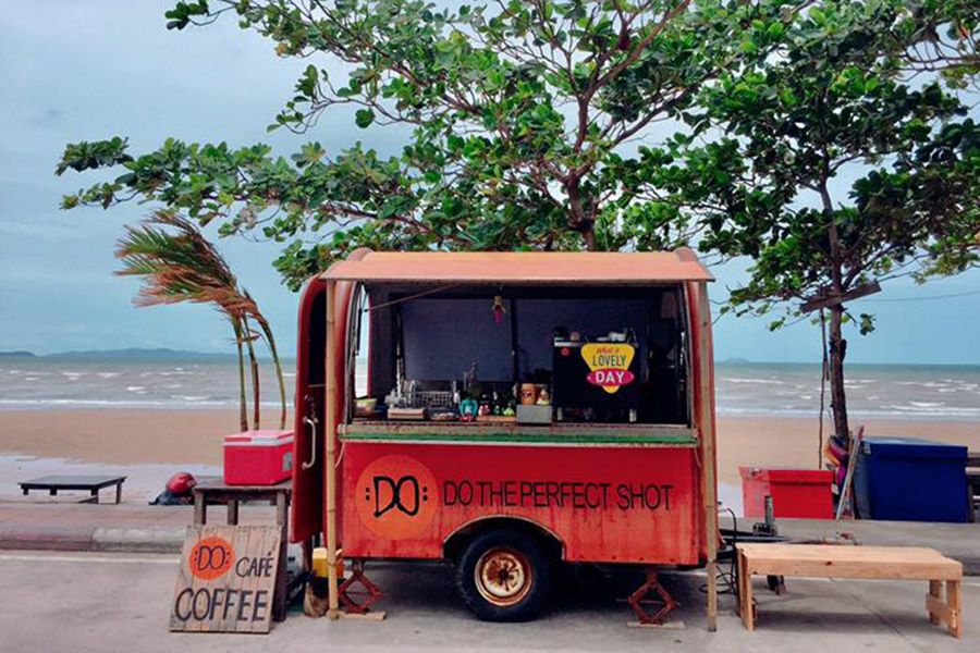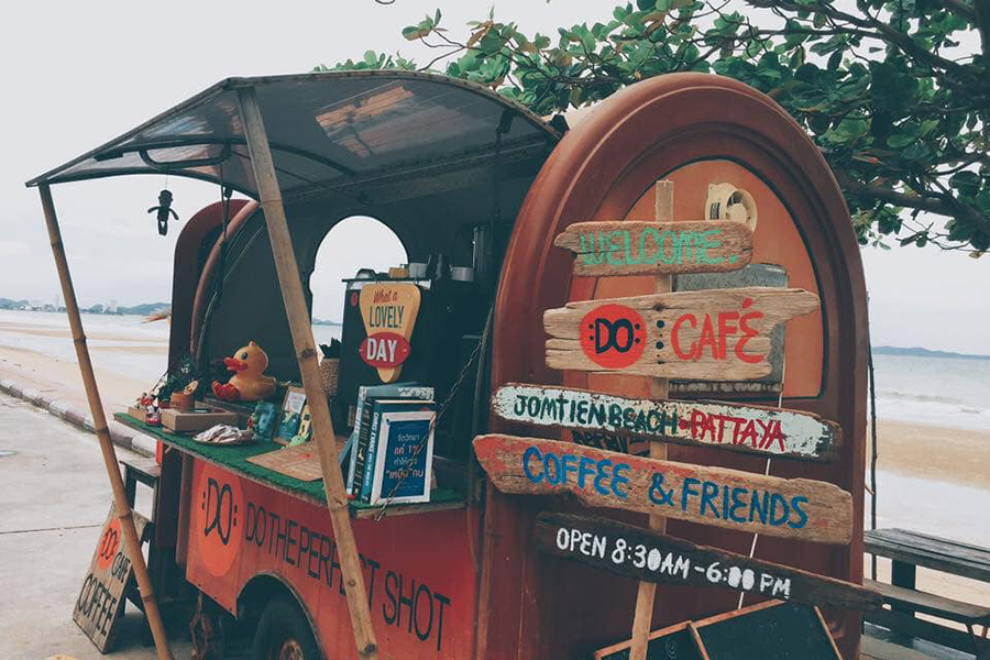 คาเฟ่แนวสตรีทสุดอินดี้ ริมหาดจอมเทียน เมืองพัทยา Do Café : Coffee Truck เป็นลักษณะรถขายกาแฟ ตกแต่งแบบเรียบง่ายสไตล์มินิมอล มีที่นั่งหันหน้าเข้าหาทะเล เหมาะสำหรับคนที่ต้องการจิบเครื่องดื่มรับลมแบบชิลล์ๆ แต่เห็นร้านเล็กๆ แบบนี้รองรับลูกค้าได้ถึง 20-30 ที่นั่งเชียวนะ ความน่ารักของ Do Café : Coffee Truck ยังไม่หมดเพียงเท่านี้ เมื่อสั่งเครื่องดื่มทั้งร้อนและเย็นจะเสิร์ฟคู่กับบิสกิตทุกแก้ว นอกจากนี้ทางร้านยังเขียนข้อความให้กำลังใจภาษาอังกฤษเก๋ๆ บนแก้วเครื่องดื่มเย็นอีกด้วย น่ารักแบบนี้ต้องแวะนั่งกันสักครั้งแล้วล่ะ