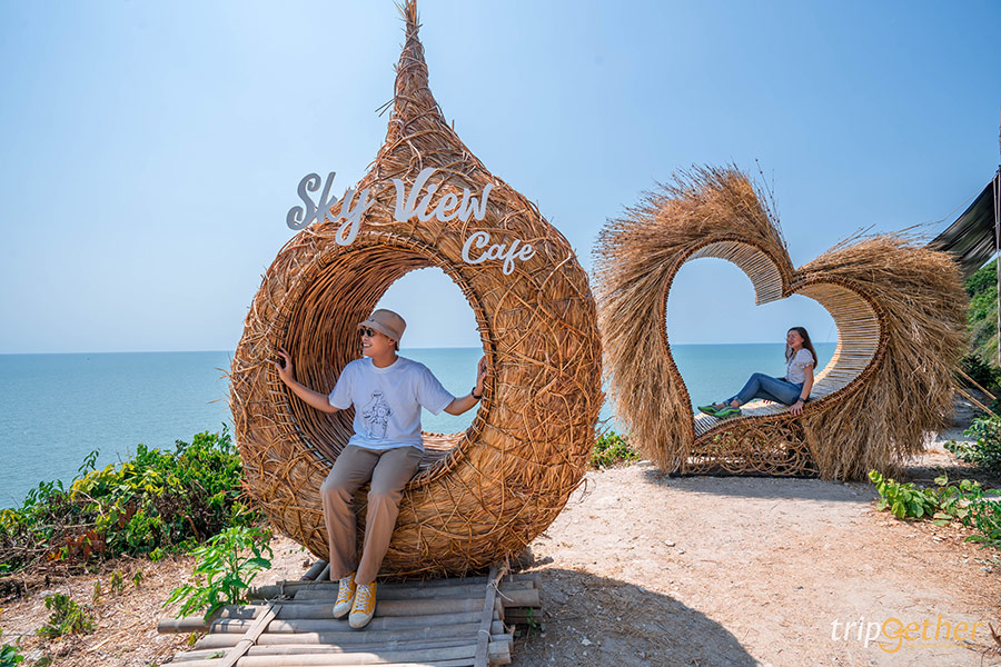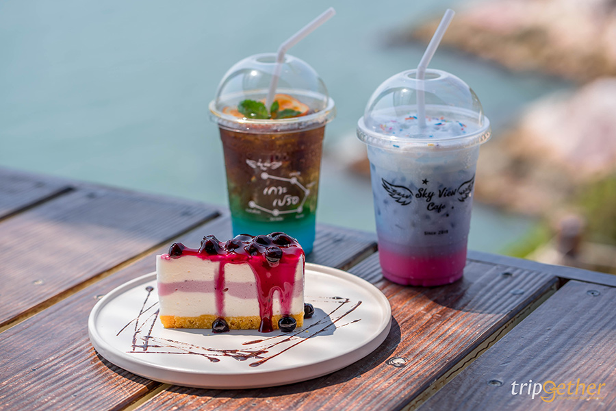 Sky View Cafe คาเฟ่บนเกาะเปริดตั้งอยู่บนโลเคชั่นสุดปังที่มีเพียงที่เดียวในประเทศไทยเลยก็ว่าได้ ด้วยตัวร้านที่ตกแต่งสไตล์ลอฟท์ปูนเปลื่อยเท่ๆ เลือกนั่งได้ทั้งโซนในห้องแอร์ของร้านและโซนเอ้าท์ดอร์ที่จัดสรรพื้นที่เอาไว้อย่างดี สำหรับมุมฮิตที่คนต่อคิวรอถ่ายรูปบอกเลยว่าพลาดไม่ได้กับมุมเปลตาข่ายที่สามารถมองเห็นวิวทะเลได้แบบพาโนรามาเลยทีเดียว แต่ก็มีมุมถ่ายรูปอื่นๆ อีกเพียบทั้งบันไดสวรรค์และมุมที่นั่งบาหลี สำหรับเมนูอาหารและเครื่องดื่มมีทั้ง บลูเบอร์รี่ชีสพายที่ต้องรับประทานคู่กับน้ำแข็งซันไชน์ ตามมาด้วย ออเรนจ์ทวิสต์เอสเพรสโซ่, นมเรนโบว์, สกายคอฟฟี่ และเลม่อนโซดา เติมความสดชื่นระหว่างรอถ่ายรูปได้เป็นอย่างดีแน่นอน และอีกจุดถ่ายรูปสวยๆ ต้องเดินต่อมาอีกหน่อยคือ จุดชมวิวซันชายน์ ผาสุขนิรันด์ ที่มองเห็นวิวหน้าผาหินริมทะเลบอกเลยว่าอันซีนสุดๆ