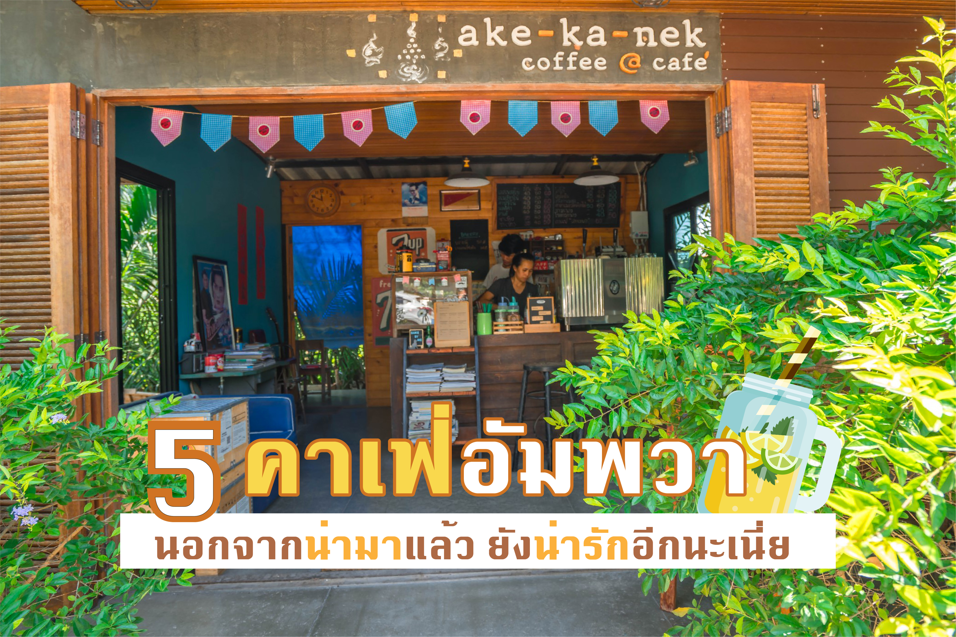 5 คาเฟ่สุดน่ารักที่อัมพวา เมื่อคุณมาถึงอัมพวา ต้องไม่พลาดที่จะมานั่งดื่มน้ำ ทานขนมให้หายเหนื่อย นอกจากอิ่มท้องแล้วยังมีรูปสวยๆ ไว้อัพลงโปรไฟล์เฟสบุคเก๋ๆ ด้วยนะ ซึ่งแต่ละร้านนำวัตถุดิบที่มีในท้องถิ่นมาปรุง จนเกิดเป็นเมนูเด็ดประจำร้าน มาดูกันว่า 5 คาเฟ่นี้จะน่ารักโดนใจคุณบ้างรึเปล่า