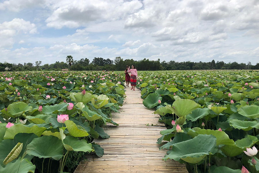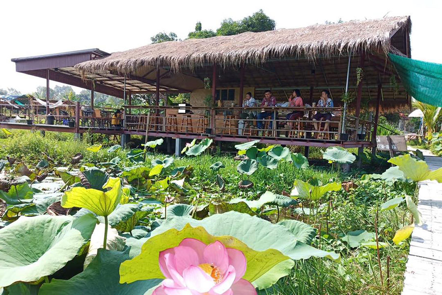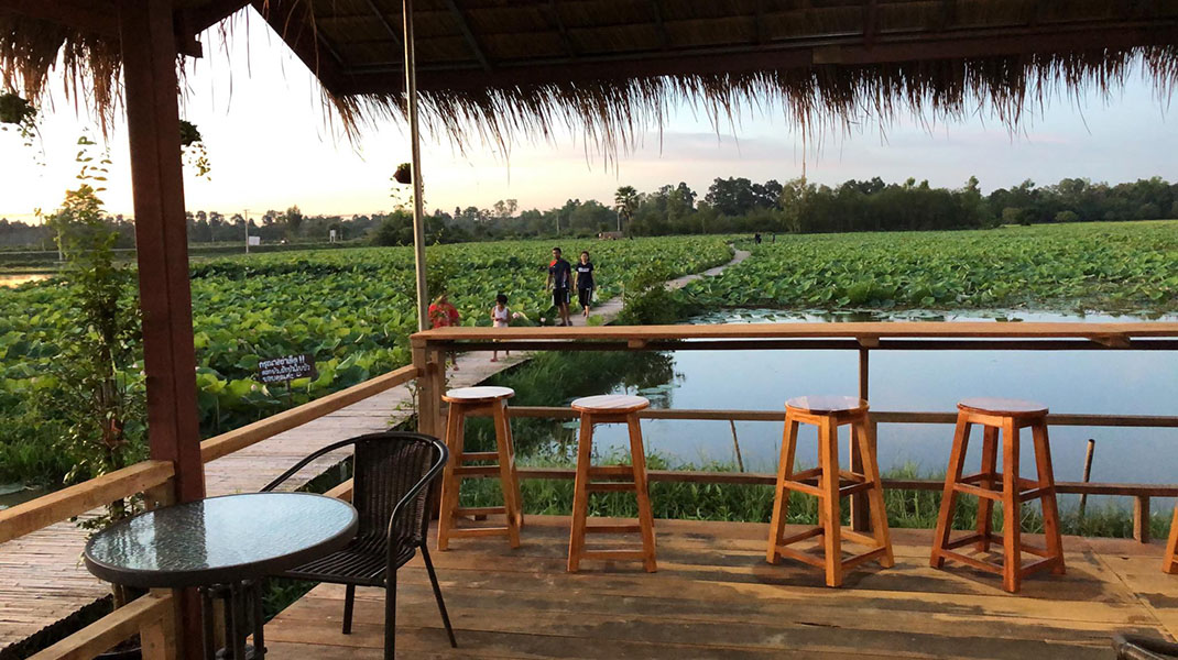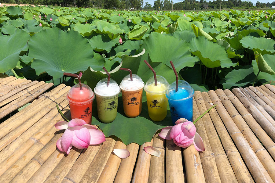 คาเฟ่กลางนาบัว บรรยากาศสุดร่มรื่น บัวนาคาเฟ่ ร้านเป็นลักษณะโอเพ่นแอร์ เน้นนั่งชิลล์แบบธรรมชาติ บอกเลยว่าลมโชยทั้งวันอากาศไม่ร้อนอย่างที่คิด ตัวร้านเน้นใช้วัสดุจากธรรมชาติ หลังคามุงด้วยหญ้าคา เพิ่มความรู้สึกโปร่งโล่งสบาย เมนูแนะนำที่จะต้องลองก็คือ เมี่ยงคำกลีบดอกบัว เป็นเมนูที่หลายคนอาจไม่เคยกินที่ไหนมาก่อน สำหรับระยะเวลาแต่ละช่วงของดอกบัว จะขึ้นอยู่กับฤดูฝน ปกติแล้วประมาณเดือน พฤษภาคม – มิถุนายน จะเริ่มออกดอกแล้ว ซึ่งจะมีอายุอยู่ประมาณ 2 เดือน และจะต้องใช้ระยะเวลาประมาณ 2 เดือนถึงจะออกดอกอีกครั้ง สลับแปลงไปเรื่อยๆ เพื่อให้มีดอกบัวตลอดทั้งปี จนกว่าน้ำจะหมด หากใครอยากไปชมดอกบัวเต็มทุ่งจะต้องเลือกไปให้ถูกช่วงนะจ๊ะ