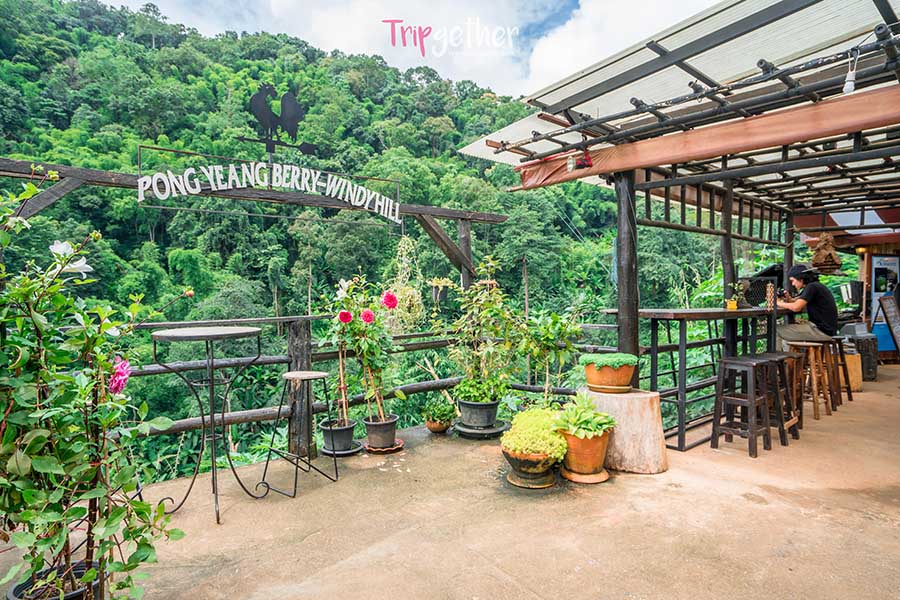 โป่งแยง เบอร์รี่ วินดี้ฮิลล์ อีกหนึ่งคาเฟ่โซนแม่ริม ที่อยู่บริเวณทางขึ้นที่จะไปยังรีสอร์ทต่างๆ ในม่อนแจ่ม ร้านนี้โดดเด่นโลเคชั่นที่อยู่ริมหน้าผาและติดถนน เรียกว่ายังไงต้องผ่านอย่างแน่นอน ซึ่งตัวร้านดีไซน์ในแบบเรียบง่าย เน้นวัสดุธรรมชาติเข้ากับบรรยากาศ มีมุมถ่ายรูปและจุดชมวิวที่ช่วงเช้าจะมีหมอกให้ชมด้วย ด้านเมนูที่นี่จะเน้นเสริฟเครื่องดื่มเป็นหลัก มีทั้งกาแฟ ชา รวมถึงเมนูน้ำผลไม้ปั่นอย่าง อะโวคาโดและสตรอว์เบอร์รี ที่เรียกว่าเก็บกันสดๆ จากดอย รับรองได้ถึงความฉ่ำและรสชาติที่สุดจะฟิน