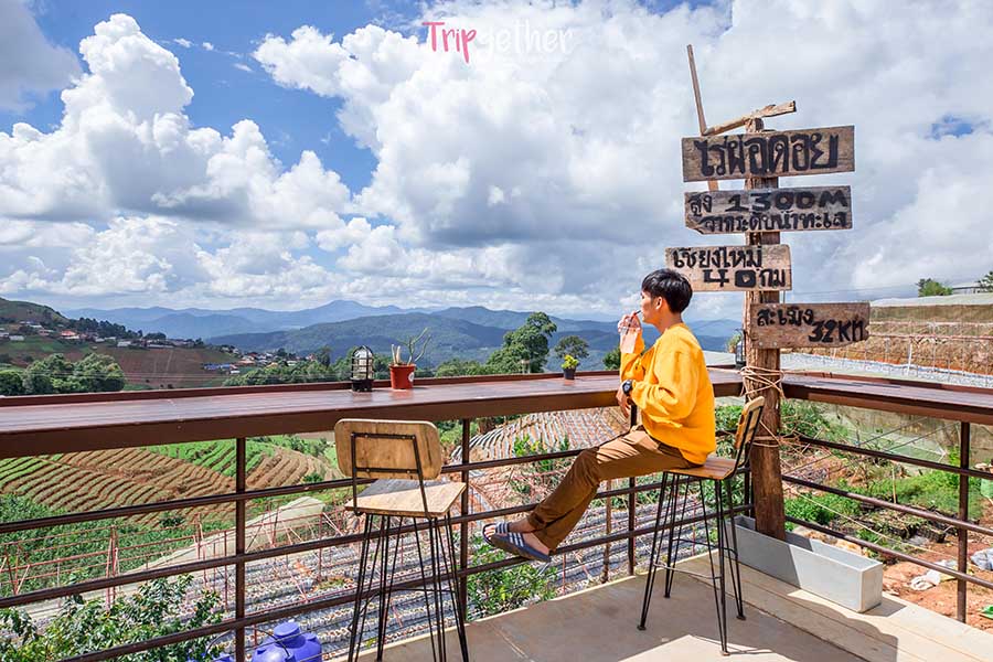 ปิดท้ายกันที่ ไรผ่อดอยกาแฟ ร้านนี้ตั้งอยู่ใจกลางม่อนแจ่มอย่างแท้จริง เด่นสง่าอยู่บริเวณ 3 แยก ซึ่งเป็นทางที่จะแยกไปยังรีสอร์ทต่างๆ ภายในตัวร้านมากมายด้วยมุมนั่งทั้งในอินดอร์ และโซนระเบียงที่เปิดโล่งให้รับแดดยามเช้าชมวิวหมอกและขุนเขา ช่วงหน้าหนาวด้านล่างจะเป็นแปลงสตรอว์เบอร์รี บรรยากาศดีสุดๆ ส่วนเมนูที่นี่จะเสริฟเฉพาะเครื่องดื่มทั้งร้อนและเย็น กว่า 20 เมนู ราคาเริ่มต้นเพียง 50 บาท เป็นอีกหนึ่งร้านวิวดีที่แอบกระซิบว่าต้องแวะมานั่งชิลล์กันไม่ผิดหวัง