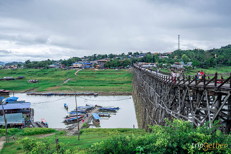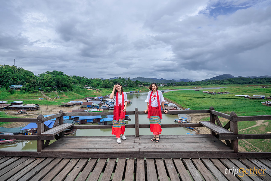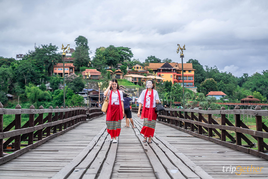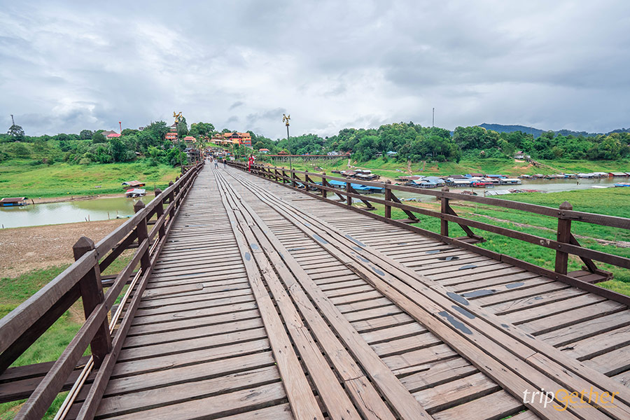 สะพานมอญสังขละบุรี ตั้งอยู่ในอำเภอสังขละบุรีที่อยู่ติดกับชายแดนของประเทศเมียนมาร์ ได้ขึ้นชื่อว่าเป็นสะพานไม้ที่ยาวที่สุดในประเทศไทยมีอายุมาประมาณ 30 ปีโดยใช้เพียงเครื่องไม้เครื่องมือพื้นบ้านและแรงงานคนที่เลื่อมใสศรัทธาในหลวงพ่ออุตตมะ พระเกจิชื่อดังที่ชาวมอญและพุทธศาสนิกชนเคารพศรัทธา ซึ่งใช้เวลาถึง 10 ปีกว่าสะพานนี้จะสร้างเสร็จและมีความยาวถึง 850 เมตร ถือว่าเป็นสะพานแห่งความสามัคคีของชาวมอญ สะพานนี้สร้างขึ้นเพื่อใช้ข้ามแม่น้ำซองกาเลียซึ่งเป็นแม่น้ำที่แบ่งอำเภอสังขละบุรีถือเป็นสะพานที่เชื่อมระหว่างสองวัฒนธรรมอย่างมอญและไทยเข้าด้วยกันได้อย่างลงตัว และกิจกรรมที่ไม่ควรพลาดก็คือการตักบาตรแบบมอญในช่วงเช้าเวลาประมาณ 06.30 – 07.00 น. สามารถแวะซื้อชุดตักบาตรที่หน้าทางเข้าสะพานมอญแล้วข้ามไปจับจองพื้นที่รอใส่บาตรกันบนสะพานได้เลย เรียกได้ว่าจะได้สัมผัสกับวิถีชีวิตจริงๆ ของชาวมอญที่ยังคงสืบทอดต่อกันมาจนถึงปัจจุบัน