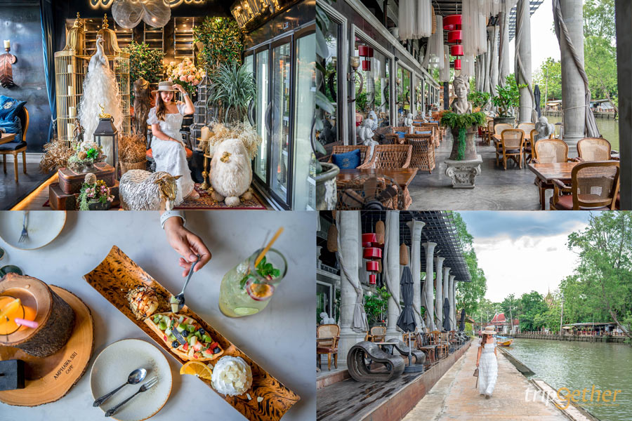 หลังจากไหว้พระขอพรกันจนอิ่มใจแล้ว เราก็มาอิ่มท้องกันต่อที่ อัมพวาศรี คาเฟ่ คาเฟ่ริมน้ำที่ตกแต่งสไตล์เรเนซองส์และเวนิสที่ผสมผสานความเป็นไทย ส่งให้บรรยากาศภายในร้านดูมีสีสันและเต็มไปด้วยงานศิลปะที่ผ่านการจัดวางและตกแต่ง ไม่ว่าจะมองไปมุมไหนของร้านก็สวยคลาสสิคเป็นที่สุด โซนที่นั่งของร้านก็มีให้เลือกทั้งโซนอินดอร์ที่ตกแต่งอย่างหรูหราและเอาท์ดอร์ริมน้ำสบายๆ นอกจากนี้เมนูอาหารของทางร้านก็จัดเต็มทั้งของคาวและของหวานให้เลือกกันเพียบ