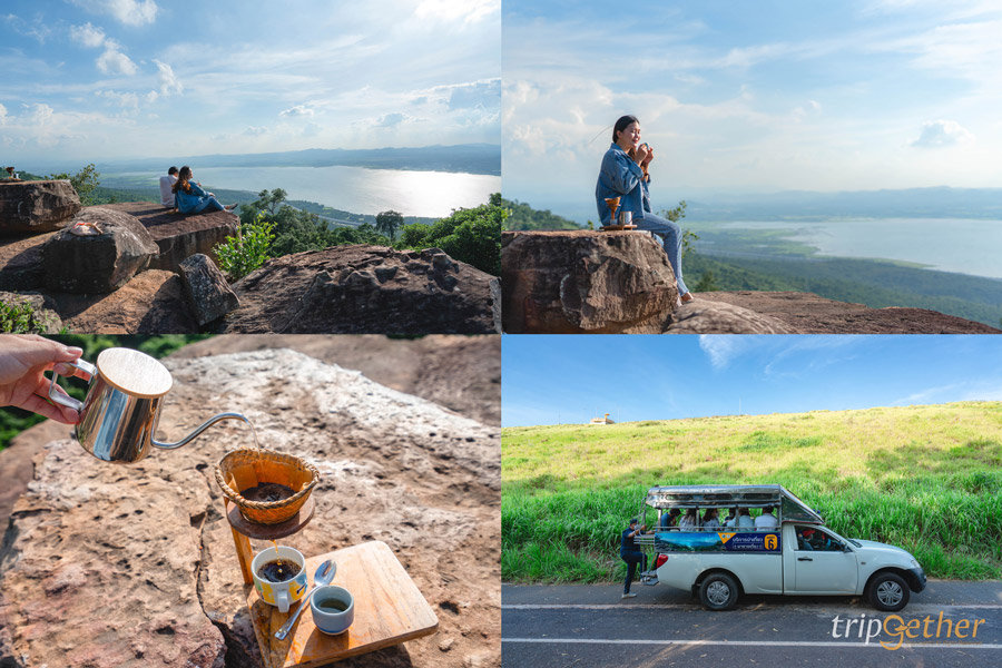 ปิดท้ายทริปด้วยการไปเสพบรรยากาศภาพวิวหลักล้านกันที่ จุดชมวิวผายายเที่ยง สถานที่อันซีนอีกแห่งหนึ่งของไทย โดยจากบนผายายเที่ยงแห่งนี้สามารถมองเห็นภาพทิวทัศน์ของสายน้ำในเขื่อนลำตะคอง แนวเขาที่ราบสูง และรับลมเย็นๆ ได้แบบพาโนรามา เท่านั้นยังไม่พอยังมีร้านกาแฟที่บริการชุดดริปกาแฟริมหน้าผาแบบชิลล์ๆ อีกด้วย นั่งจิบกาแฟ ห้อยขาริมหน้าผา บอกเลยว่าฟิน มีความสุขแบบเต็มสูบกลับบ้านแน่นอน