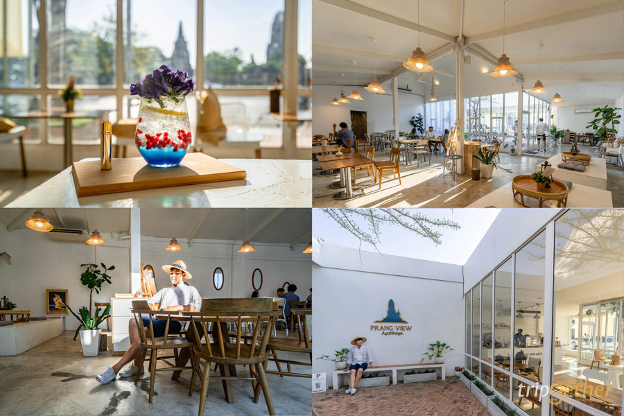 เติมพลังใจกันไปแล้ว มาเติมพลังกายกันต่อที่ ปรางค์วิว คาเฟ่ คาเฟ่สุดมินิมอลที่เน้นโทนสีขาวและกระจกใสที่สามารถมองเห็นยอดพระปรางค์ของวัดราชบูรณะ สามารถมานั่งกินของหวานอร่อยๆ พร้อมมองวิวโบราณสถานแบบชิลล์ๆ โซนที่นั่งของร้านมีทั้งโซนอินดอร์แอร์เย็นฉ่ำ และโซนเอาท์ดอร์น่ารักๆ ที่สามารถ่ายรูปสวยๆ ได้ ส่วนเมนูของทางร้านก็มีให้เลือกเพียบ ไม่ว่าจะเป็น ปรางค์วิวโบเคเมนูเครื่องดื่มสุดสดชื่น และของหวานอย่างบิงซูชาไทยไข่เค็ม ที่เสิร์ฟพร้อมครีมไข่เค็มและบัวลอยฉ่ำๆ บอกเลยว่าฟินสุดๆ