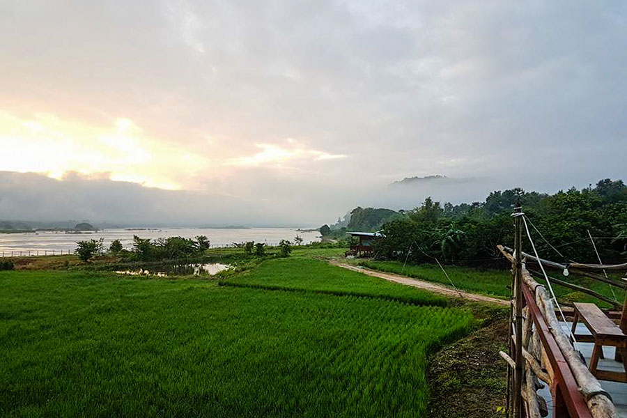 อีกหนึ่งที่พักบรรยากาศสุดกรีน หมอกริมโขง รีสอร์ท ที่พักท่ามกลางทุ่งนาริมแม่น้ำโขง ดื่มด่ำไปกับบรรยากาศสีเขียวของท้องทุ่งนาและภูเขาที่เขียวขจี บ้านพักทุกหลังมีความเป็นส่วนตัวสุดๆ ตื่นเช้ามาสัมผัสอากาศเย็นสบาย เรียกได้ว่าเป็นการไปพักผ่อนอย่างแท้จริง ยิ่งใครที่ไปช่วงปลายฝนต้นหนาวบอกเลยว่าฟินสุดๆ