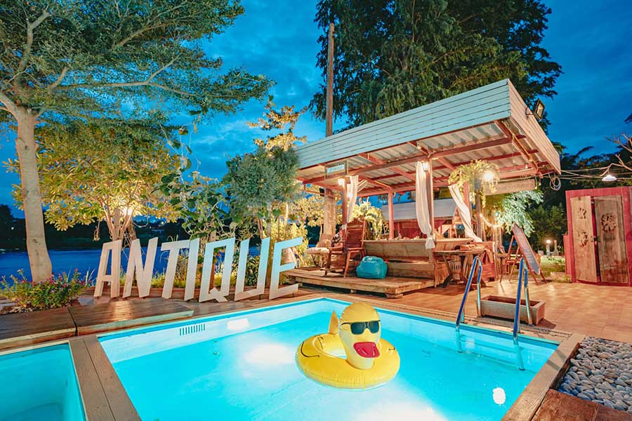 ดิ แอนธีค ริเวอร์ไซด์ ที่พักสุดชิลล์ในอำเภอบ้านโป่งแห่งนี้ มาพร้อมกับบรรยากาศริมน้ำแม่กลอง เป็นทิวทัศน์ที่สวยงามและร่มรื่นมากๆ ด้านการตกแต่งมาในสไตล์รัสติกที่ผสมผสานกับวัสดุธรรมชาติได้อย่างลงตัว ส่วนของห้องพักที่นี่มีให้เลือกหลากหลายแบบทั้ง ห้องนครรามา, ลานหลิว, เยาวราช, อาม่า, โบตั๋น, เจ้าจอม และพระนคร อีกทั้งยังมีบ้านพักแบบเป็นหลังที่มีชื่อว่า บ้านชมนคร, บ้านคีตนคร, บ้านนครชุมน์, ซาฟารีแลนด์ และบ้านพักไฮไลท์ยอดนิยม บัสโฮม บ้านพักสุดเก๋ที่ดัดแปลงมาจากรถบัส พร้อมภายในที่ตกแต่งมาในสไตล์วินเทจเท่ๆ นอกจากนี้ยังมีพื้นที่ส่วนกลางอย่างสระว่ายน้ำ และโซนพักผ่อนชมวิวให้ผู้ที่มาเยือนได้เพลิดเพลินตลอดการเข้าพัก