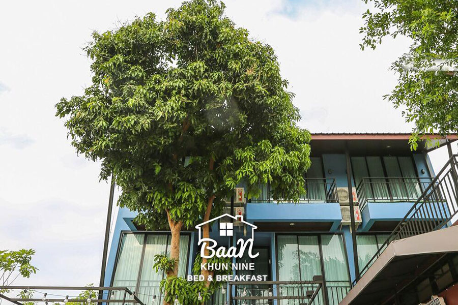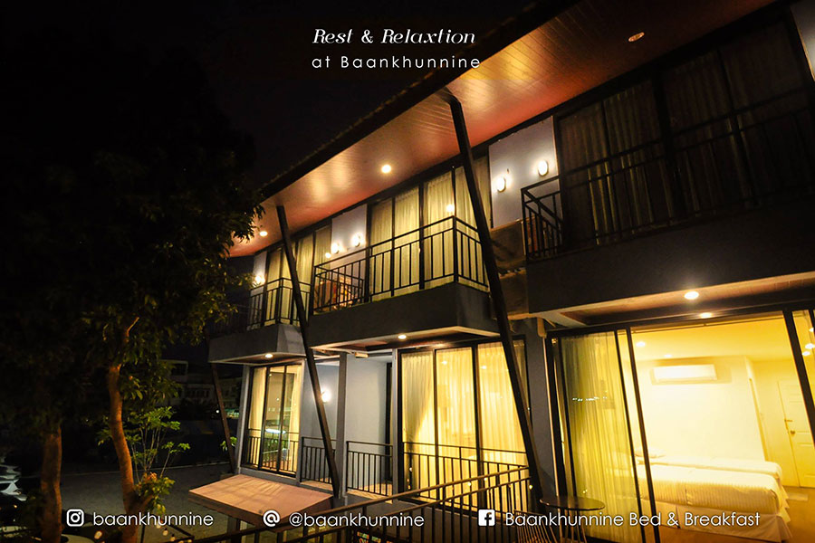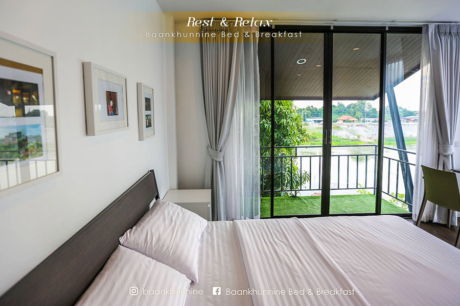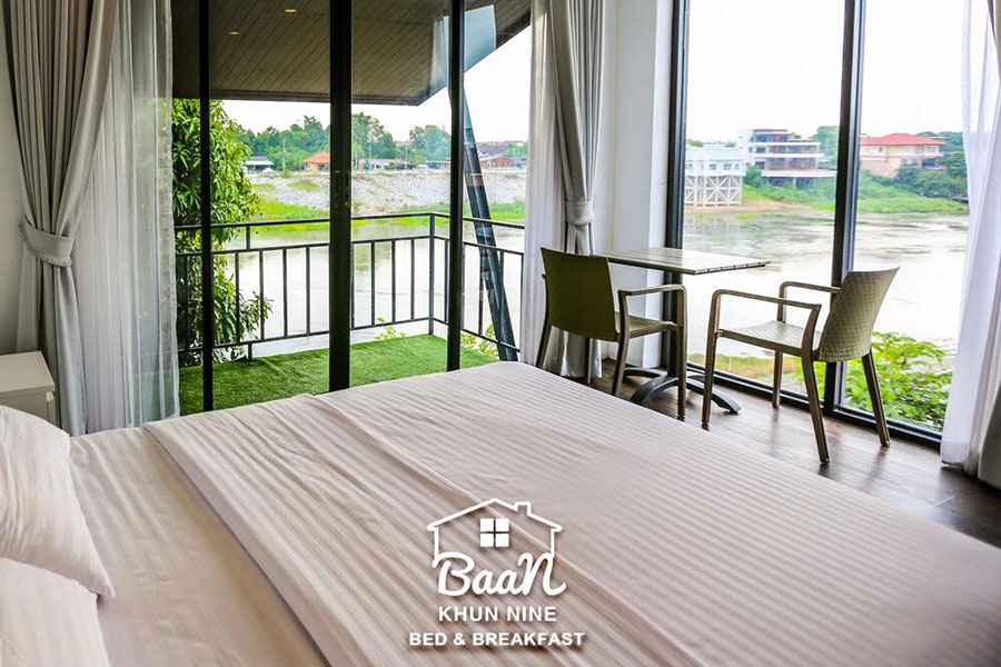 บ้านคุณไนน์ เบด แอนด์ เบรกฟาสต์ ที่พักบรรยากาศดีติดริมน้ำแม่กลองแห่งนี้มีเรื่องราว เพราะถ้าย้อนไปเมื่อ 50 ปีที่แล้ว ที่แห่งนี้เป็นโรงไม้เก่าแก่ ต่อมาได้ถูกรีโนเวทเป็นร้านอาหารพร้อมที่พักริมน้ำ ที่ตกแต่งมาในสไตล์ไทยร่วมสมัย โดยเป็นการนำเอาความคลาสสิคของเมืองเก่า มาผสมผสานกับความทันสมัยในปัจจุบัน ด้านห้องพักตกแต่งมาแบบเรียบง่าย โดยจะเน้นให้เห็นวิวของแม่น้ำเป็นหลัก มาพร้อมเฟอร์นิเจอร์และสิ่งอำนวยความสะดวกครบครัน นอกจากนี้ยังมีพื้นที่พักผ่อนตรงระเบียงที่สามารถนังพักรับลม ชมวิวได้ตลอดทั้งวัน ถือเป็นอีกหนึ่งที่พักบรรยากาศดีติดริมน้ำ ที่น่ามาพักผ่อนในช่วงวันหยุด