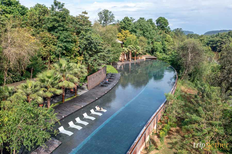 ปิดท้ายด้วย ที่พักริมน้ำสุดหรูใกล้กรุงเทพ ริมแม่น้ำแคว วิวภูเขา ท่ามกลางบรรยากาศดี ครอสริเวอร์แคว (Cross River Kwai) ดีไซน์สวยงามมาก โดยมีการออกแบบด้วยดีเทลการตกแต่งให้เชื่อมโยงกับเรื่องราวทางประวัติศาสตร์ นำเอาความเป็นเมืองกาญจนบุรีเข้ามาใช้ ไม่ว่าจะเป็นสะพานข้ามแม่น้ำแควหรือทางรถไฟสายมรณะ น้ำตก ภูเขาหินจำลอง หมอนลายหิน ทำให้ ที่พักริมน้ำสุดหรูแห่งนี้ และห้องพักที่จำลองมาจากถ้ำแถมห้องพักแต่ละห้องก็มีความกว้างขวาง มีมุมให้ถ่ายรูปสวยๆ เยอะมาก ใครที่มีแพลนจะมาพักผ่อนที่กาญจนบุรี แล้วอยากดื่มด่ำความงดงามของธรรมชาติวิวแม่น้ำและภูเขา พร้อมความสะดวกสบายแนะนำที่ ครอสริเวอร์แคว เลย