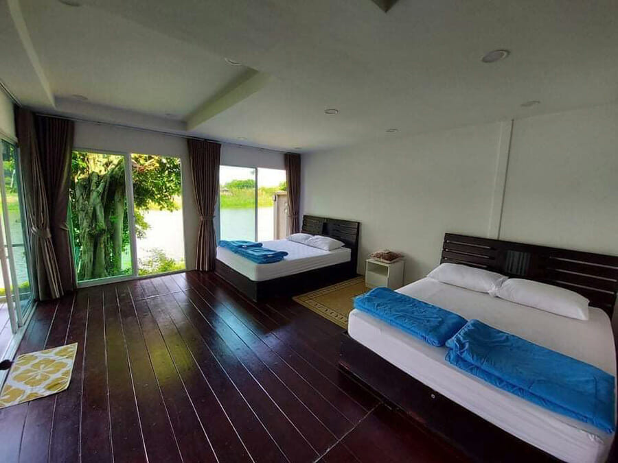 ริมน้ำบ้านเพื่อน รีสอร์ท ตั้งอยู่ติดกับริมแม่น้ำท่าจีน พื้นที่รอบๆ ที่พักรายล้อมไปด้วยความเขียวชอุ่มของต้นไม้และมีสายน้ำขนาดใหญ่ไหลผ่านหน้าที่พัก ใกล้ชนิดที่เดินไม่กี่ก้าวก็โดดลงน้ำเย็นๆ ได้เลย เรียกได้ว่าเป็นบรรยากาศของการพักผ่อนแม้จริง สำหรับที่นี่เหมาะกับคนที่อยากชวนเพื่อนหรือพาครอบครัวมาทำกิจกรรมชิลล์ๆ รวมกัน โดยที่พักนี้รองรับผู้เข้าพักเป็นกลุ่ม จำนวนตั้งแต่ 6 – 15 คน นอกจากจะนอนสบายและเป็นส่วนตัว ยังมีกิจกรรมให้ทำอย่าง พายเรือ ตกปลา เล่นน้ำ ร้องคาราโอเกะ และปิ้งย่าง ถือว่าเป็นที่พักริมน้ำสุพรรณบุรีที่สายตี้ห้ามพลาดเด็ดขาด