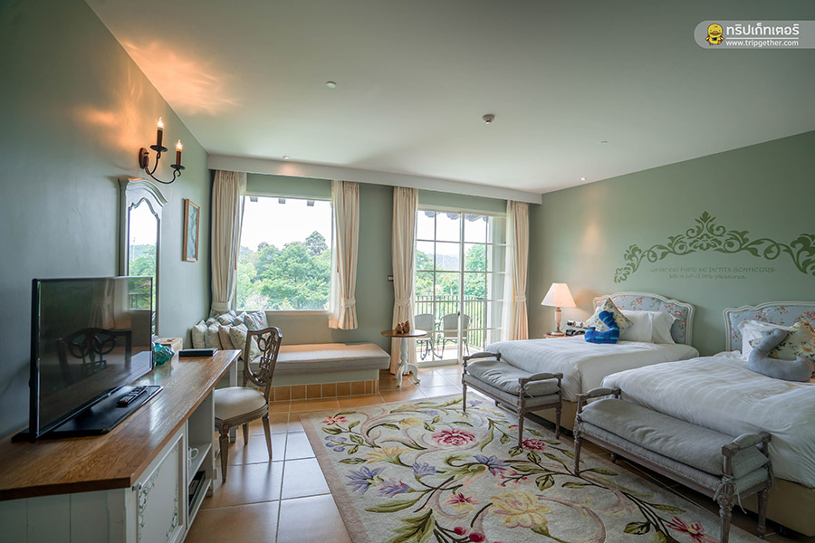 ที่พักสุดหรูท่ามกลางบรรยากาศธรรมชาติด้วยดีไซน์สุดเก๋ไก๋ของความเป็นปราสาทในหมู่บ้านฝรั่งเศสที่มีห้องพักทั้งหมด 63 ห้อง 4 ไทป์ ได้แก่ Superior Room เป็นห้องพักที่ตกแต่งเรียบง่ายน่าพักผ่อนในโทนสีสันสดใสที่มาพร้อมห้องนั่งเล่นชมวิวสวน, Deluxe Room with High Tea set ห้องดีลักซ์ที่มาพร้อมชุดน้ำชายามบ่าย ภายในตกแต่งอย่างหรูหราด้วยสีสันสบายตาในโทนสีม่วงลาเวนเดอร์, Suite Room with High Tea Set & Welcome Massage ห้องสวีทที่ออกแบบอย่างพิถีพิถันด้วยความหรูหรามีพื้นที่ใช้สอยกว้างขวาง แบ่งสัดส่วนห้องนั่งเล่นและห้องนอนออกจากกันได้อย่างลงตัว และ Deluxe Family Connecting Rooms with High Tea Set ห้องดีลักซ์แฟมิลี่ที่จะเปลี่ยนวันพักผ่อนแสนธรรมดาของคุณให้กลายเป็นวันสุดพิเศษด้วยชุดน้ำชายามบ่ายที่เข้าพักได้สูงสุด 5 คน พร้อมห้องนอนแยกสัดส่วนกันอย่างชัดเจนและจัดสรรพื้นที่ใช้สอยในการพักผ่อนได้อย่างลงตัว ที่ไม่ว่าคุณจะอยู่มุมไหนก็สัมผัสได้ถึงความสวยงามหรูหราของปราสาทแห่งนี้อย่างแน่นอน