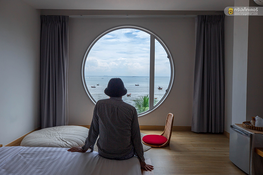 ที่พักสไตล์มินิมอลตกแต่งน่ารักตั้งอยู่บนหาดวานนภา ตัวอาคารเป็นอาคารรีโนเวทใหม่มีทั้งหมด 6 ชั้น โดยบริเวณชั้นบนสุดเป็นดาดฟ้าให้ขึ้นไปนั่งชมวิวทะเลได้สบายๆ โดยภายในห้องพักตกแต่งแบบเรียบง่ายใช้เฟอร์นิเจอร์สไตล์ญี่ปุ่นตัดกับผนังห้องสีขาวได้อย่างลงตัว มาพร้อมไฮไลท์โดดเด่นอย่างหน้าต่างที่มีทั้งทรงกลม หรือแบบสี่เหลี่ยมบานใหญ่ให้สามารถมองวิวท้องทะเลได้อย่างชัดเจน นอกจากมีห้องพักสวยแล้ว ที่นี่ยังมีคาเฟ่น่ารักอย่างร้าน A Blank Coffee อยู่บริเวณด้านล่างอาคารอีกด้วย สำหรับคอกาแฟก็สามารถสั่งเครื่องดื่มมานั่งจิบเพลินๆ ก่อนออกไปเที่ยวต่อก็ยังได้ หากใครเป็นสายมินิมอลชอบถ่ายรูปละก็ไม่ควรพลาดมาชิลล์ที่ Marina Seaview Bangsaen