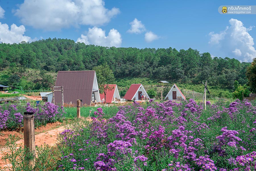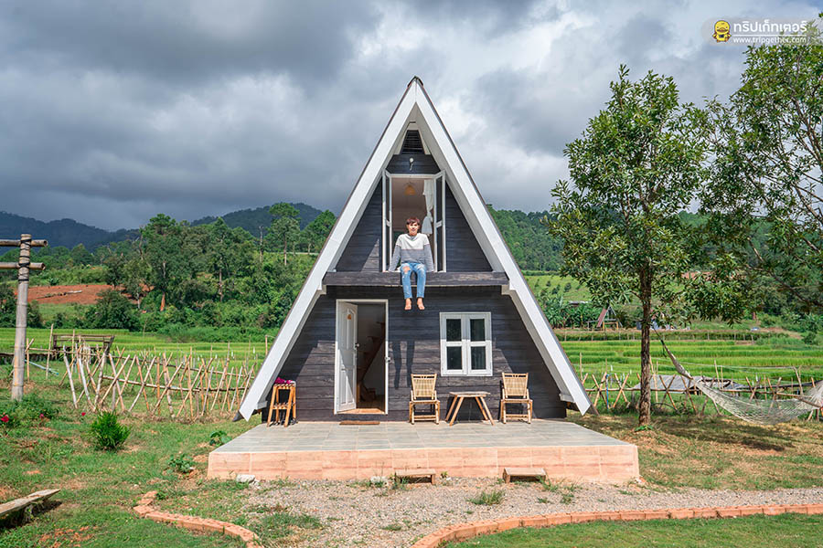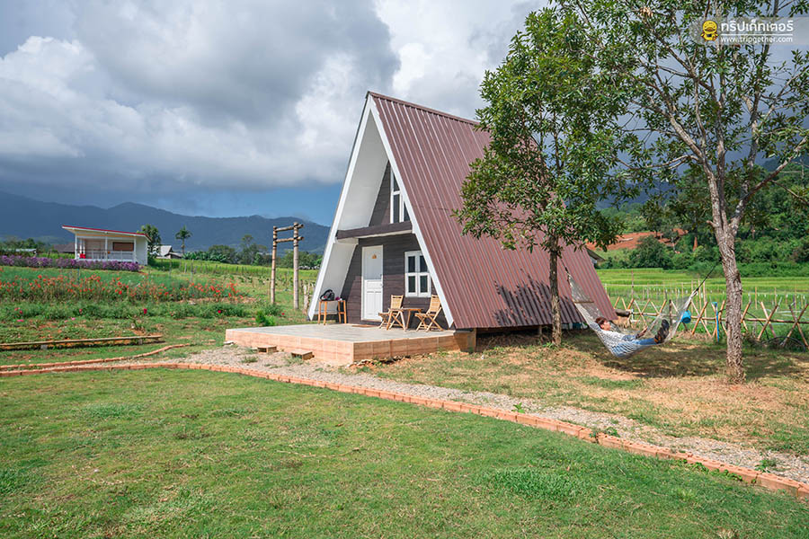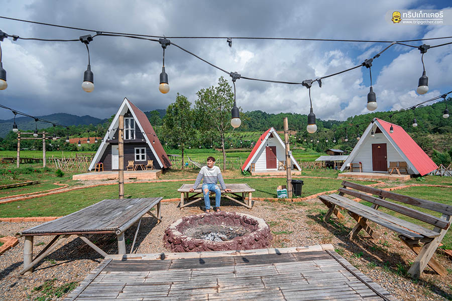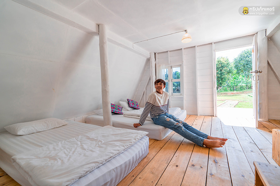 บ้านพักบนดอยตั้งอยู่ในลานกว้างรายล้อมไปด้วยดอกไม้นานาพันธุ์ และนาข้าวอันเขียวขจี พร้อมวิวสวยด้านหลังเป็นภูเขา มีบ้านพัก 2 แบบคือ บ้านหลังใหญ่ ที่สามารถเข้าพักได้ 4 คน และบ้านหลังเล็ก สามารถเข้าพักได้ 2 คน ดีไซน์ของบ้านออกแบบมาในทรง A Frame แบบมินิมอล ภายในบ้านพักหลังใหญ่มี 2 ชั้น ตกแต่งเรียบง่ายเน้นโทนสีขาวกับสีน้ำตาลให้อารมณ์แบบญี่ปุ่น และยังมีไฮไลท์เด็ดคือ บริเวณระเบียงชั้น 2 ของบ้านที่ใครได้มาเยือนแล้วก็ต้องออกมานั่งห้อยขาถ่ายรูปสวยๆ กับมุมนี้ไปลงโซเชียลรัวๆ บรรยากาศที่นี่ดีมากยิ่งในเวลากลางคืนลองออกมานั่งรอบกองไฟท่ามกลางความหนาวเย็นยิ่งฟินมาก หรือใครอยากจะออกมานั่งปิ้งย่างหมูกระทะก็ได้อารมณ์สุดๆ ไปเลย