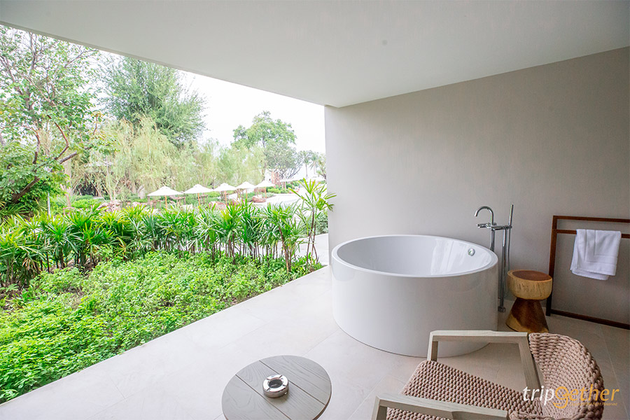 The Palayana ที่พักหัวหินติดทะเล ตั้งอยู่ช่วงหาดหัวหิน-ชะอำ เป็นรีสอร์ทเล็กๆ ที่มีบรรยากาศสุดสงบและเป็นส่วนตัวสุดๆ และแน่นอนว่าต้องมาพร้อมกับห้องที่มีอ่างอาบน้ำ ซึ่งที่นี่มีให้เลือกหลายแบบมาก เช่น Sea View Sky Villa ห้องพักวิวทะเล มีไฮไลท์คือ อ่างจากุซชี่ที่อยู่ริมระเบียง บอกเลยว่าแช่อ่างไป ชมวิวไป ฟินสุด นอกจากนี้ยังมีห้องพักให้เลือกอีกเยอะมาก รวมถึงมีสระว่ายน้ำส่วนกลางให้บริการด้วย ถ้าใครอยากพักผ่อนแบบหรูหราในบรรยากาศที่สงบ แนะนำที่นี่เลย